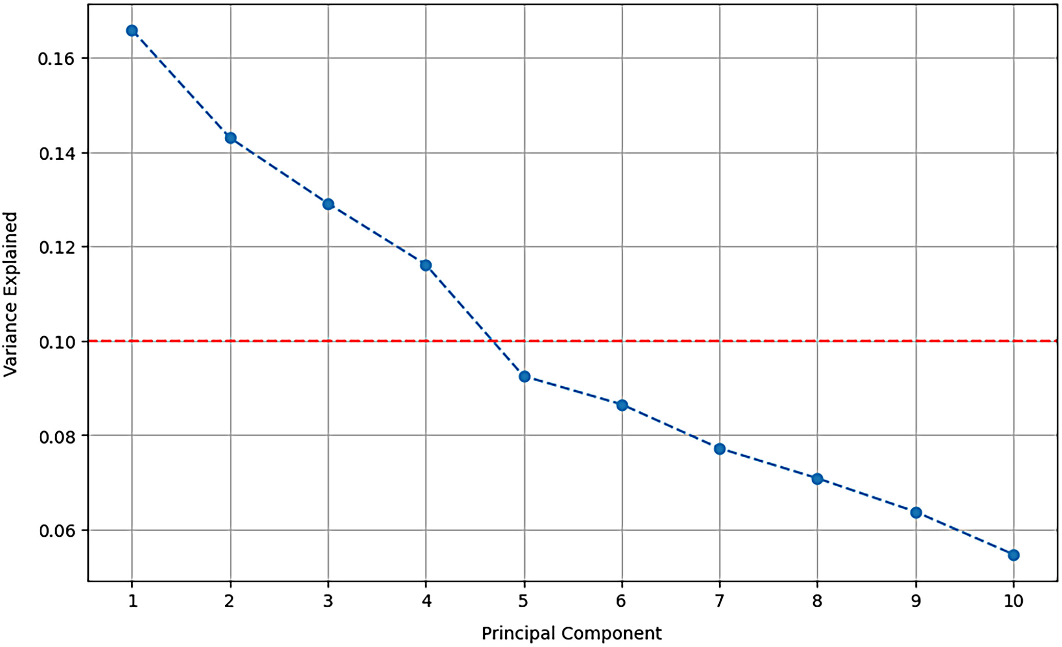 Together, these components captured 65% of the variance in the dataset, providing a meaningful reduction in dimensionality. The number of components retained was determined using a scree plot and a cumulative variance threshold of 80%, ensuring the most significant patterns were captured.
