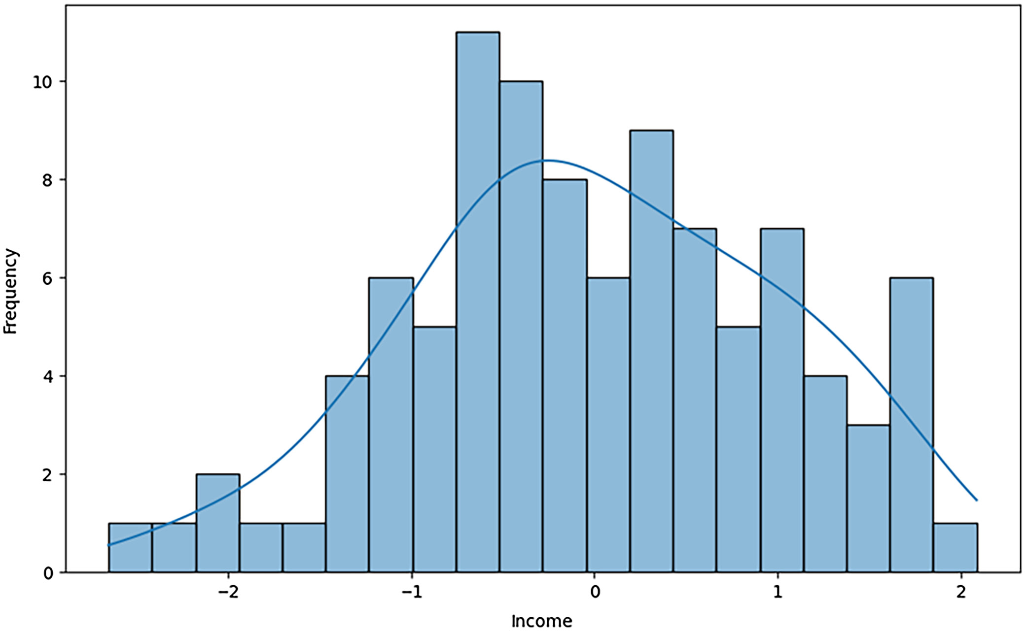 The density curve also aids in smoothing out some of the harsh features in the histogram to present the overall picture of the distribution of incomes. The curve density is dense around the mean income, where many people earn close to the mean income. The curve’s tails represent a small fraction of individuals earning significantly more or less than the rest of the population, effectively illustrating income disparity. From a significance perspective, this distribution suggests that while many individuals earn slightly above or below the average income, there remains a substantial income gap, with some individuals classified as either very high-income or low-income earners.