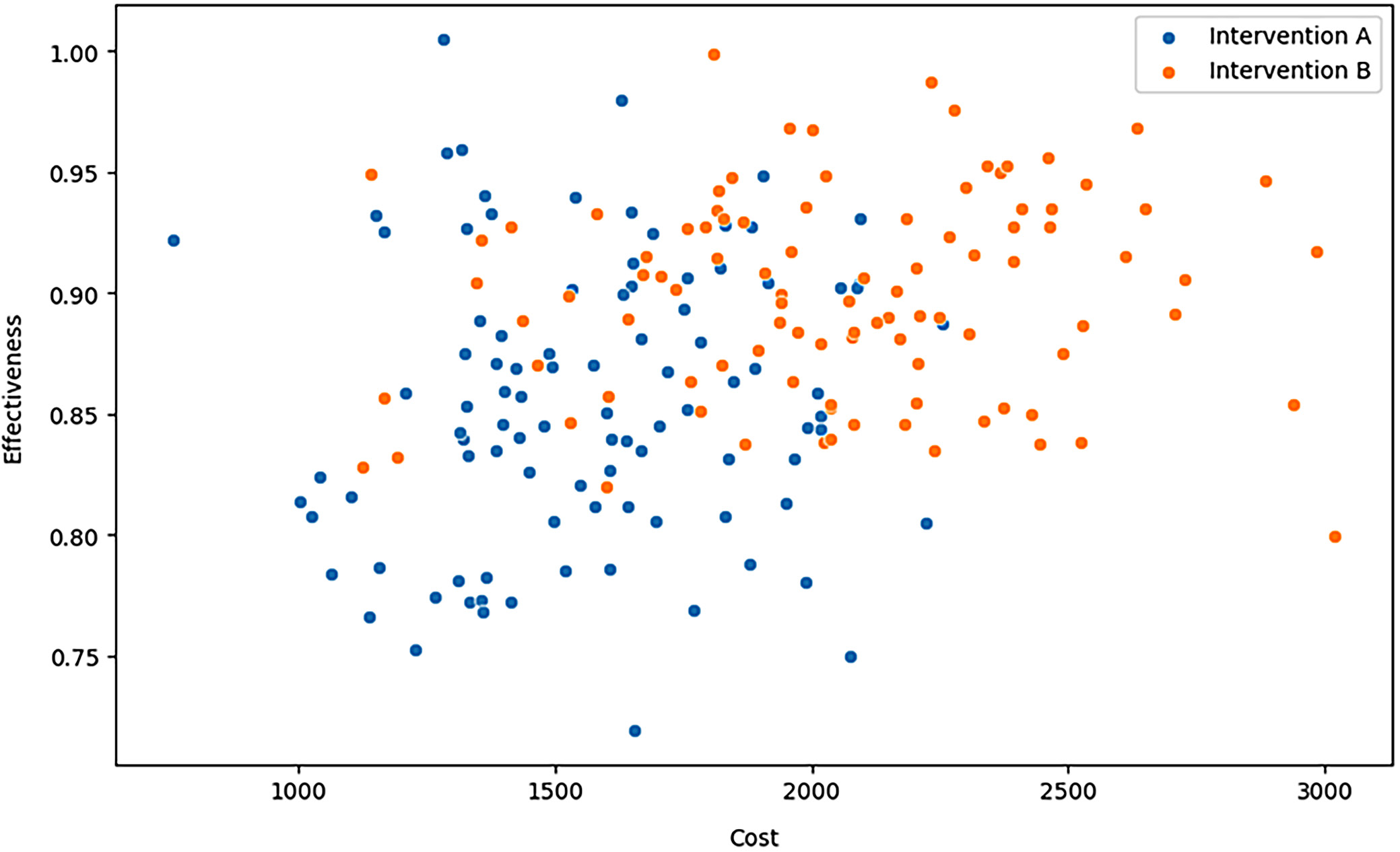 Figure 5 compares the cost and effectiveness of Intervention A and Intervention B. Every dot corresponds to the cost and the efficiency of an instance of the interventions. Blue and orange dots depict Intervention A and Intervention B, respectively. The scatter plot indicates that, in most cases, the cost of the intervention and its effectiveness can be considered proportional, where higher costs are associated with greater effectiveness. However, Intervention B is more effective than Intervention A and is offered at a similar or slightly higher cost. For example, at a cost of around $2,000, the effectiveness of Intervention B varies between 0.85 and 0.95, while the efficacy of Intervention A falls within the bracket of 0.85 and 0.90.