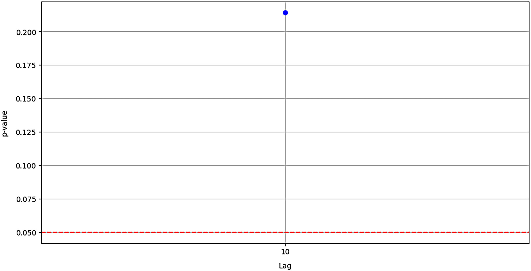 Figure 7 demonstrates the p-values from the Ljung–Box test against time series at different lags in the lower part of the graph. The Ljung–Box test is concerned with whether any of the autocorrelations of the residuals of a time series model are significantly different from 0. The horizontal bars of the graphs portray the lags, usually expressed as the number of periods measured backward in the time series. In contrast, the vertical bars indicate how statistically acceptable (or significant) a given value associated with the test is. The red dashed line here shows 0.05, which is considered the maximum for significant p-values depending on the number of lags. The plot shows that the p-values exceed 0.05 for all lags; therefore, there is no indication that the model’s residuals exhibit significant autocorrelation, even when lagged 10 times. The most positive p-value approximately at the blue dot is at lag 10, which is slightly more than 0.20, thus imposing no case for regression at this point. There is a lack of significant p-values from all lags, suggesting that the residuals look like white noise, which means that the model can adequately explain the data structure. This result enhances the credibility of this model when it is used to make predictions or make any other assumption. In summary, the model’s performance is robust and can be relied upon for accurate predictions.