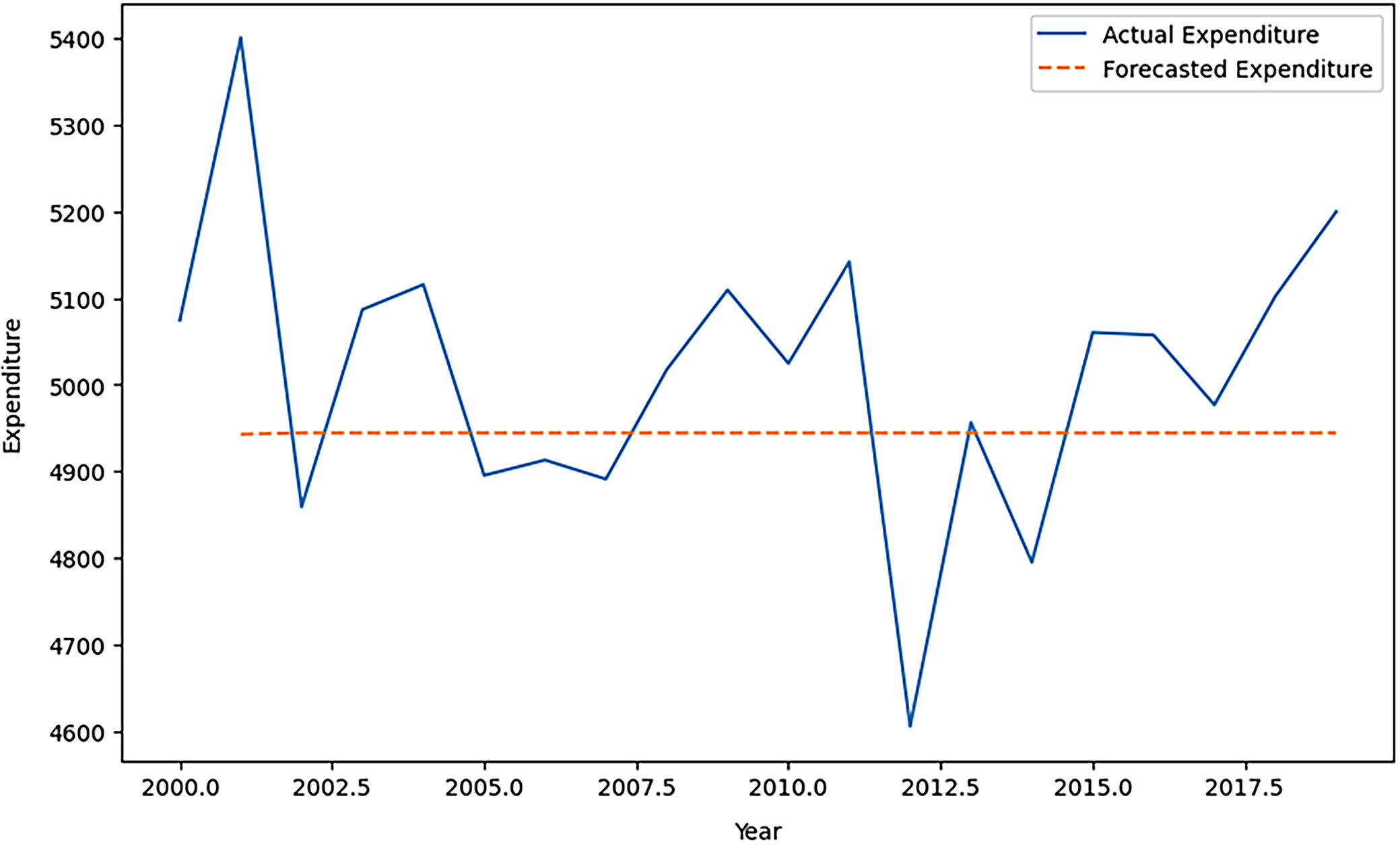 Figure 8 depicts the forecasted expenditures for healthcare, generated using ARIMA, alongside the fundamental values of healthcare expenditure for the same period. The x-axis represents the years from 2000 to 2020, while the y-axis denotes healthcare spending for each corresponding year. The ARIMA model forecasts a constant flat line for healthcare expenditure. This can indicate a lack of seasonality or trend in spending on healthcare, which is supported by the visualization of real values of healthcare expenditures. The real values do not exhibit any clear trends, and since annual data are used, there is minimal-to-no seasonality observed. Additionally, the real values do not exhibit cyclicality, as evidenced by the absence of such patterns in the graph. Consequently, the random walk model is likely the most accurate approach for forecasting.
