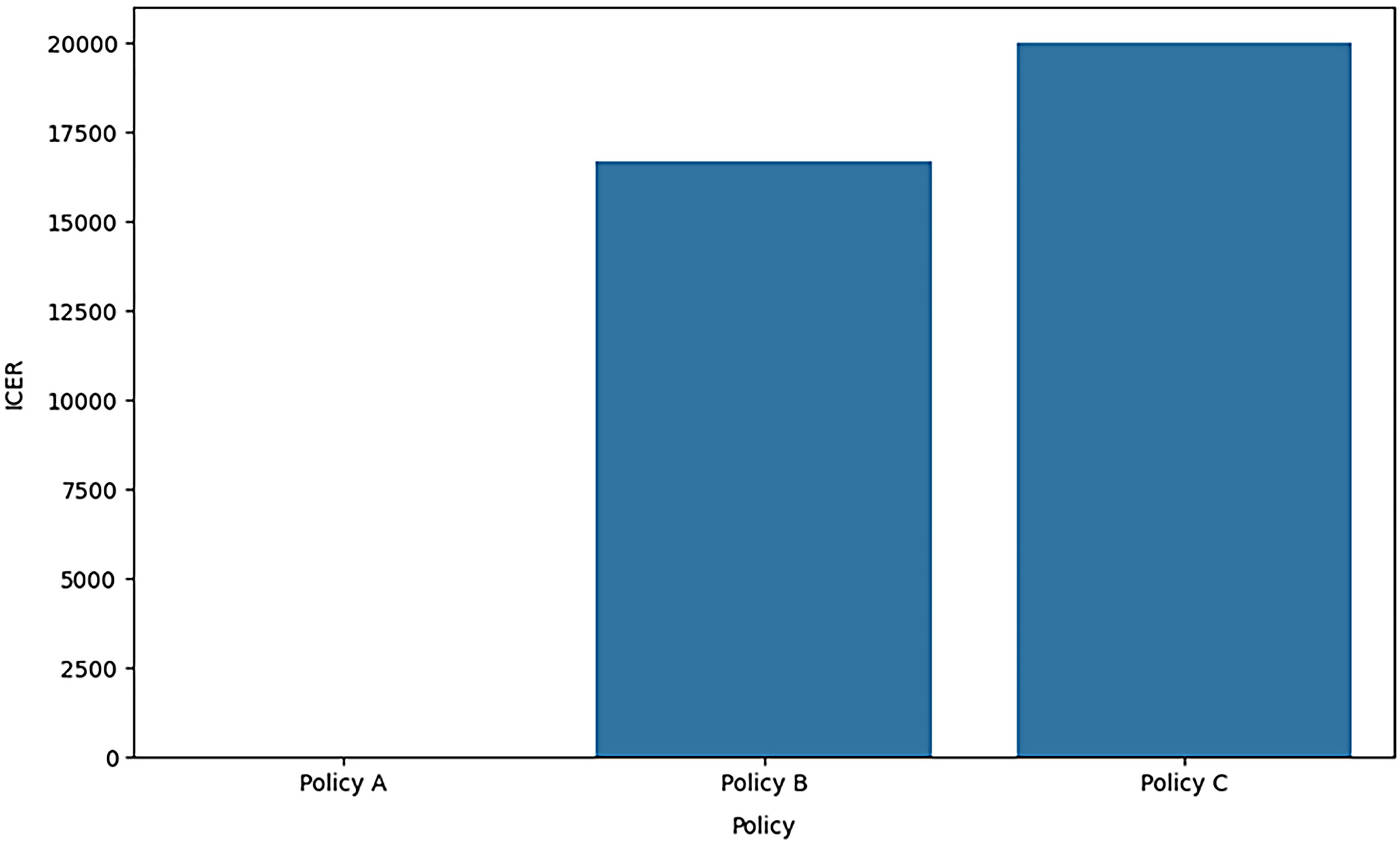 In the same context concerning the figure, it is observed that Policy C has the highest ICER, followed by Policy B and then Policy A, meaning that Policy C may yield better health outcomes. Still, it is the most expensive in terms of those benefits. Policy A, which has the lowest ICER, is cost-effective compared to the other 2 quantities. The importance of this analysis comes from the fact that it can aid policy decision-makers in knowing which policies are worth the investment to get the maximum level of health in the population. Policy C had the highest ICER, suggesting it may need to be more cost-effective as it should provide more value for the cost incurred to implement such a policy. On the other hand, Policy A has a lower ICER than Policy B, which means there are optimal balance costs and benefits, making it a preferable model for sustainable health financing.