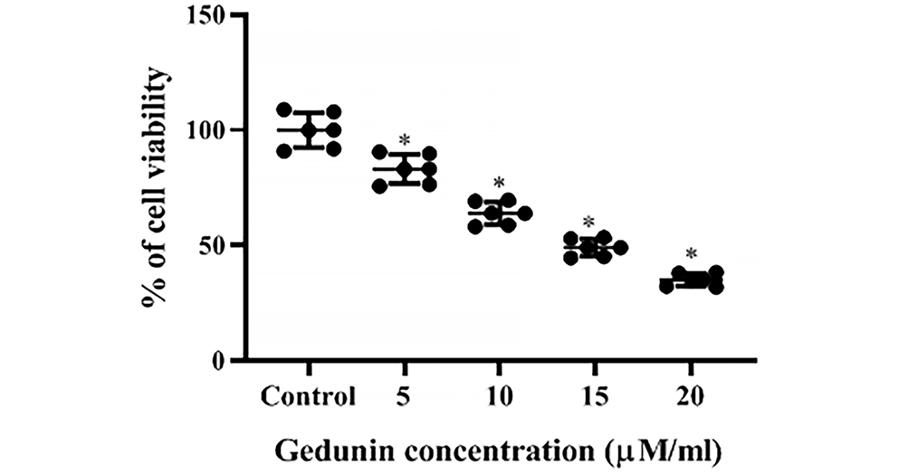 The vitality of human melanoma cells was determined using the MTT assay.23 After seeding A431 cells into 96 wells (1 × 105 cells/well), they were grown at 37°C in a moist incubator with 5% CO2. After overnight incubation, cells were dipped in PBS and exposed to GN at various doses (5, 10, 15, and 20 μM/mL) for a day. The cells were treated with a 10 μL MTT solution and left for 4 h to allow mitochondrial dehydrogenase to convert into insoluble formazan crystals. The formazan crystals were then dissolved using 150 μL of DMSO. The optical density (OD) at 490 nm was determined using an enzyme-linked immunosorbent assay (ELISA) plate Reader (Bio-Tek Instruments, USA). The IC50 values for 4-parameter logistic function dose-response curves were calculated using Sigma PlotTM software (Systat, San Jose, USA; GN concentrations that caused a 50% reduction in MTT assay). The concentrations selected for further investigation were used.