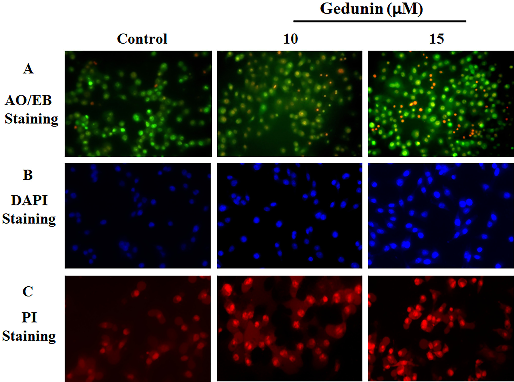 The study used AO/EB staining and labeling to observe apoptotic morphological differentiation in melanoma cells exposed to GN at 10 and 15 μM doses.24 For a full day, A431 cells were treated to 10 and 15 μM/mL of GN. The treated and control cells received the same amount of AO/EB dye mixture (100 g/mL). Following the incubation, the cells were examined using an Olympus BX51 fluorescence microscope (Olympus Corp., Tokyo, Japan) and left at room temperature in the dark for 20 min to ensure that all unbound dye had been removed by PBS washing.