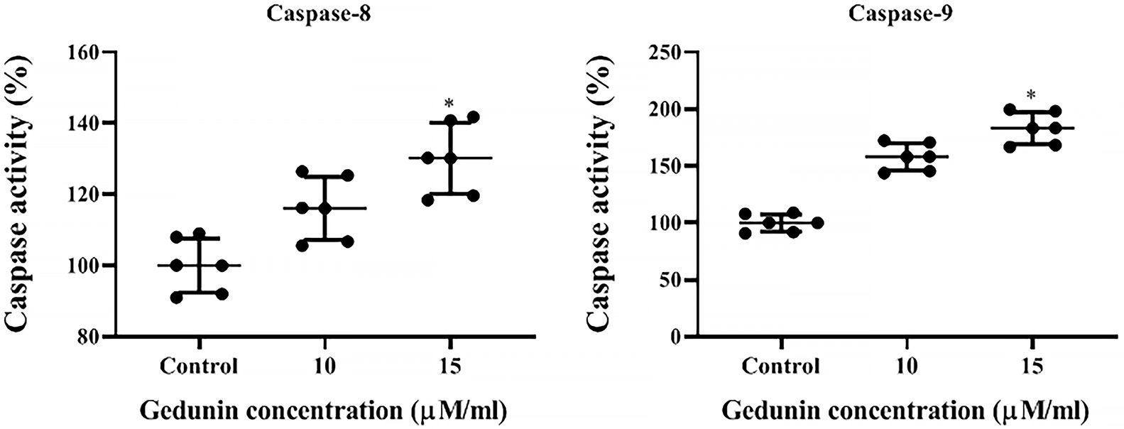 Treatment with GN of A431 melanoma cells exhibited augmented activity of caspase-9 and -8 compared to untreated control cells (Figure 3, Table 2, Table 3). The amount of caspase-9 and -8 was significantly (p < 0.05) increased by GN at a dose of 15 μM compared to 10 μM GN treatment. Gedunin improved caspase activities in a concentration-dependent way.