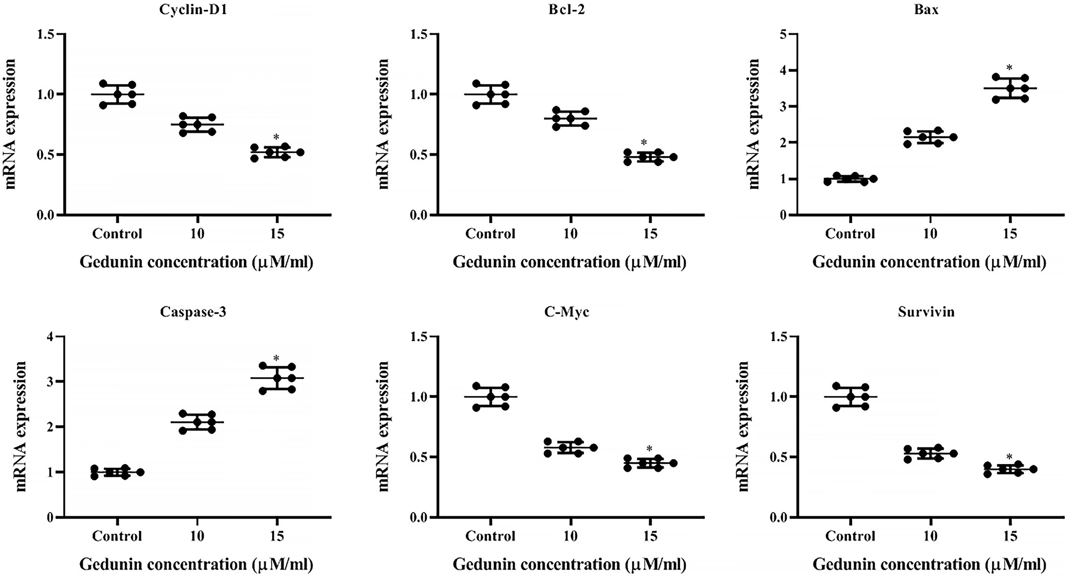 A431 cells were treated with GN (10 and 15 μM/mL) to measure the mRNA expression of proteins involved in apoptosis (Figure 4, Table 2, Table 3). While Bax and caspase-3 showed decreased mRNA expression, the untreated A431 control cells showed increased mRNA expression of cyclin-D1, Bcl-2, c-Myc, and survivin. When compared to untreated control melanoma cells, GN significantly decreased the expression of mRNAs for cyclin-D1, Bcl-2, c-Myc, and survivin, while increasing the expression of Bax and caspase-3 in a concentration-dependent manner.