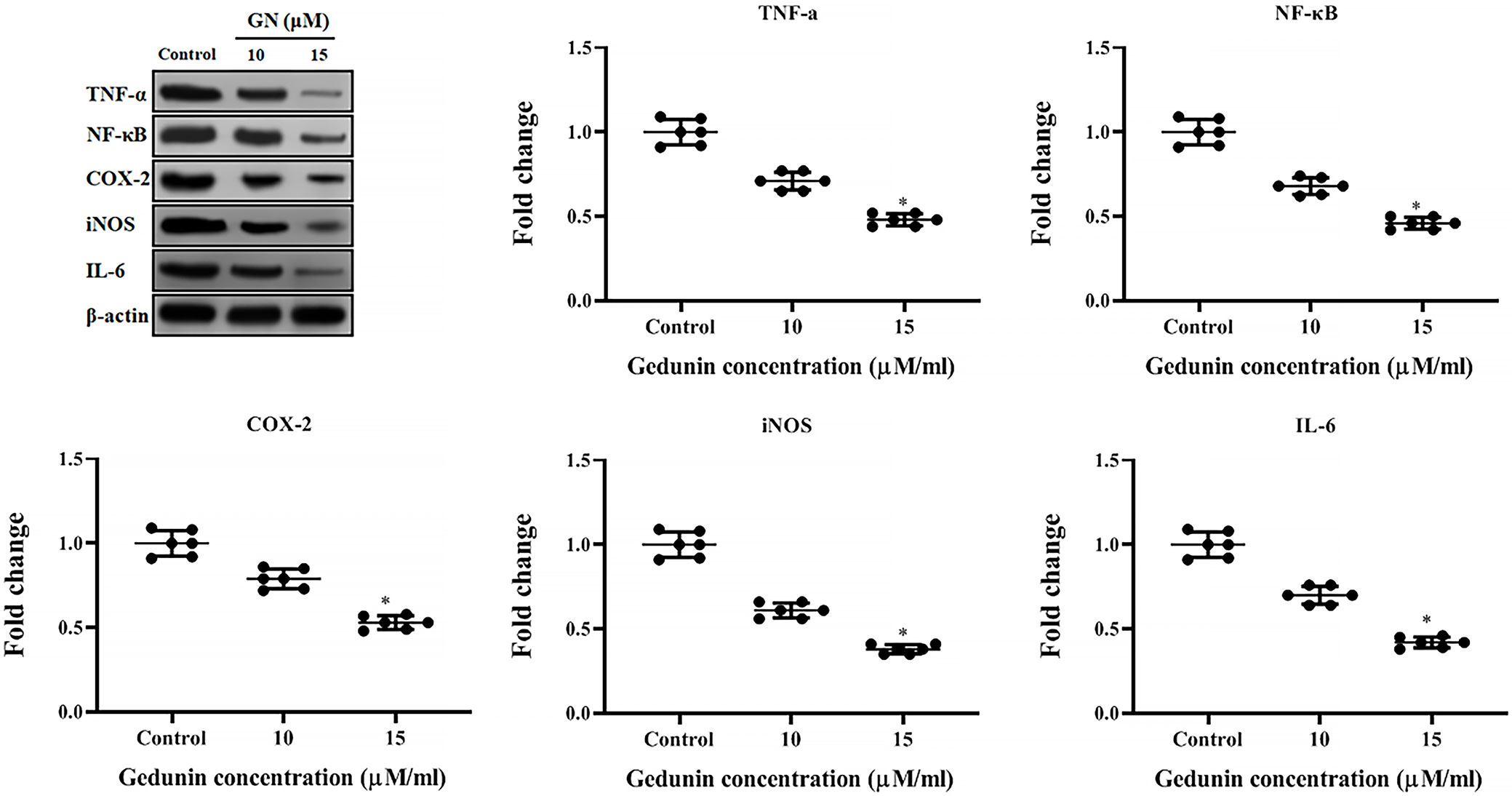 The NF-κB/TNF-α signaling has a substantial role in cancer cell growth and development. Figure 5 depicts increased protein expression of TNF-α, NF-κB, COX-2, iNOS, and IL-6 in human A431 melanoma cells (Table 2, Table 3). Treatment with GN (10 and 15 µM/mL) in the A431 cells decreased TNF-α, NF-κB, COX-2, iNOS, and IL-6 levels. In human melanoma cells, GN reduced these protein expressions in a concentration-dependent manner.