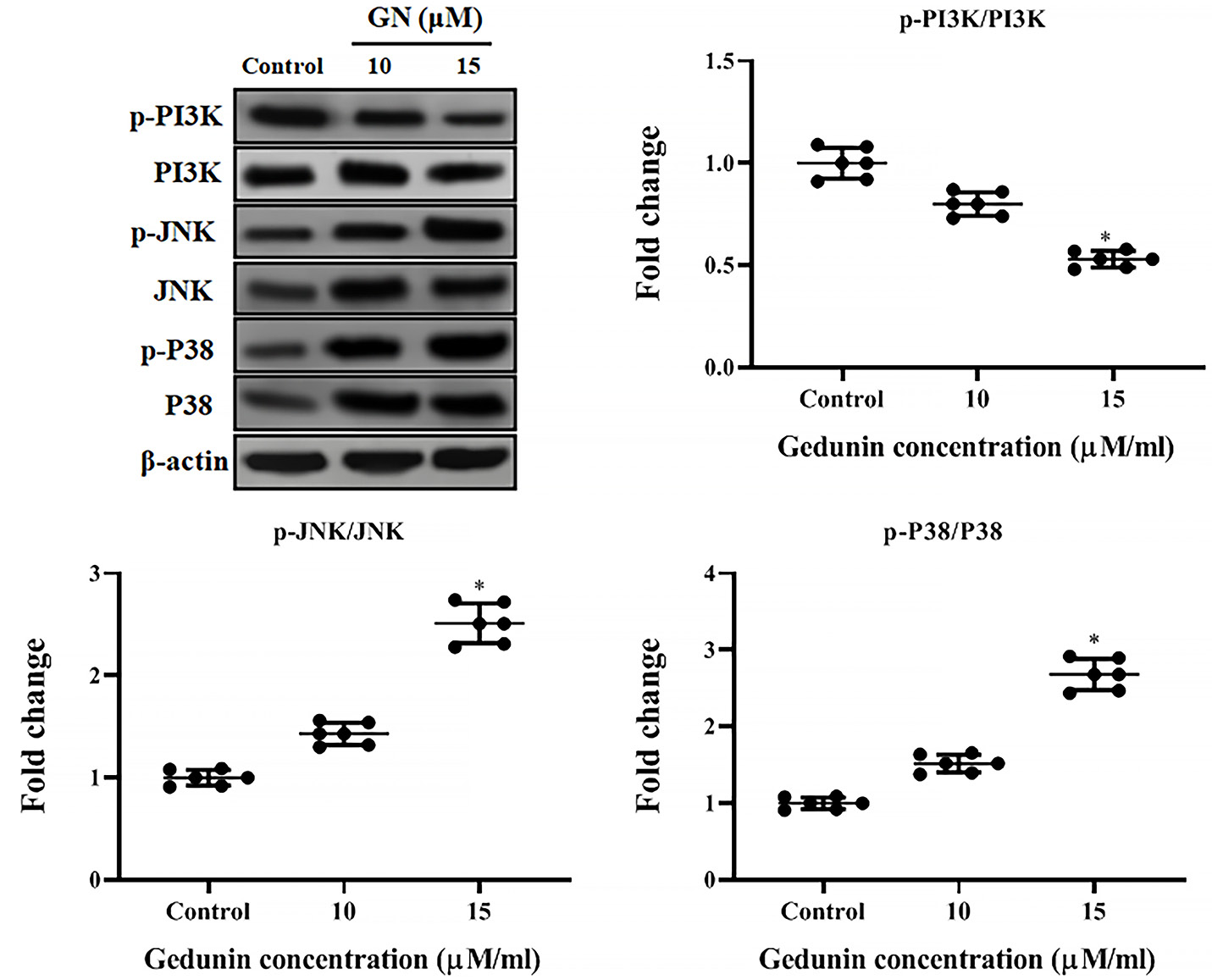 p-PI3K, PI3K, p-JNK, JNK, p38, and p38 signaling have a substantial role in cancer cell growth and development. Human A431 melanoma cells indicated intensified protein expression of P13K, JNK, and p38 (Figure 6, Table 2, Table 3). Treatment with GN (10 and 15 µM/mL) in the A431 cells decreased P13K/JNK/p38 levels. Gedunin reduced the expression of these proteins in the human melanoma cells in a concentration-dependent manner.