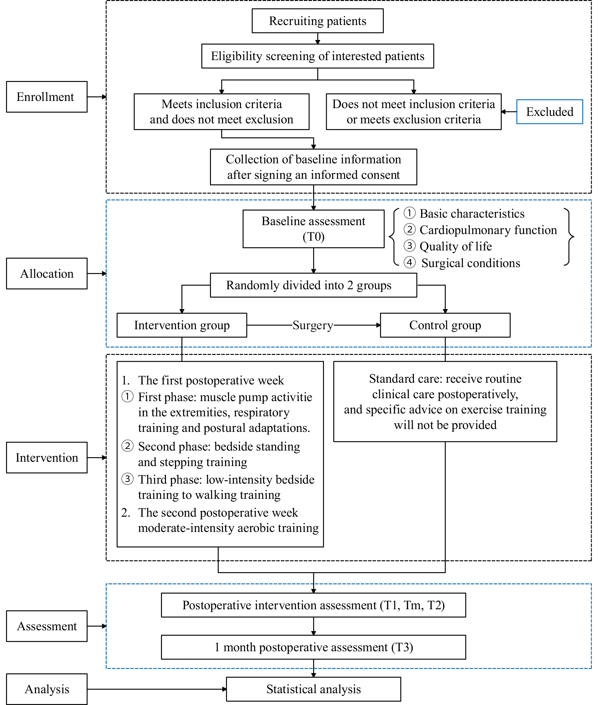 The results of the 6MWT at T1 will inform the development of moderate-intensity aerobic training to be implemented during the 2nd postoperative week (T2). Table 2 displays specific recommendations for aerobic activities. Vital signs and patient complaints will be monitored during one-on-one exercises; however, if patients are unable to remain upright or report feeling fatigued, the activity will be terminated immediately. Based on the results of the 6MWT at T1, moderate-intensity aerobic training will be continued into T2. The time interval from illness to intermittent participation will be noted on the case report form (CRF) and illustrated during data interpretation, allowing participants to resume exercise intermittently if they have to stop for 1 or 2 days due to illness.