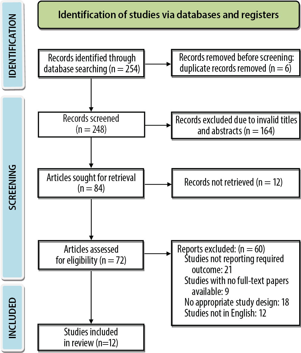 The process of selecting studies, in accordance with the Preferred Reporting Items for Systematic reviews and Meta-Analyses (PRISMA) guidelines,34 is presented in Figure 1. An electronic scanning technique was employed to perform an exhaustive search across multiple databases, leading to the identification of 254 studies that satisfied the inclusion criteria specified in the PICOS framework.35 Prior to screening, 6 duplicate documents were eliminated, bringing the total number of papers screened to 248. A total of 164 papers were subsequently excluded for having invalid titles and abstracts, and 84 records were requested for retrieval. Twelve records were not retrieved in their entirety; the eligibility of the remaining 72 reports was evaluated. Upon implementation of the inclusion-exclusion criteria, 60 studies were determined to be ineligible and were subsequently excluded. The principal determinants that led to the exclusion of research studies were their failure to provide essential outcome measures, non-access to complete text papers, unsuitable study designs, and unavailability in the English language. In conclusion, 12 systematic reviews and meta-analyses that satisfied the predetermined inclusion criteria and spanned a time period from 2000 to 2023 were incorporated into this umbrella review.