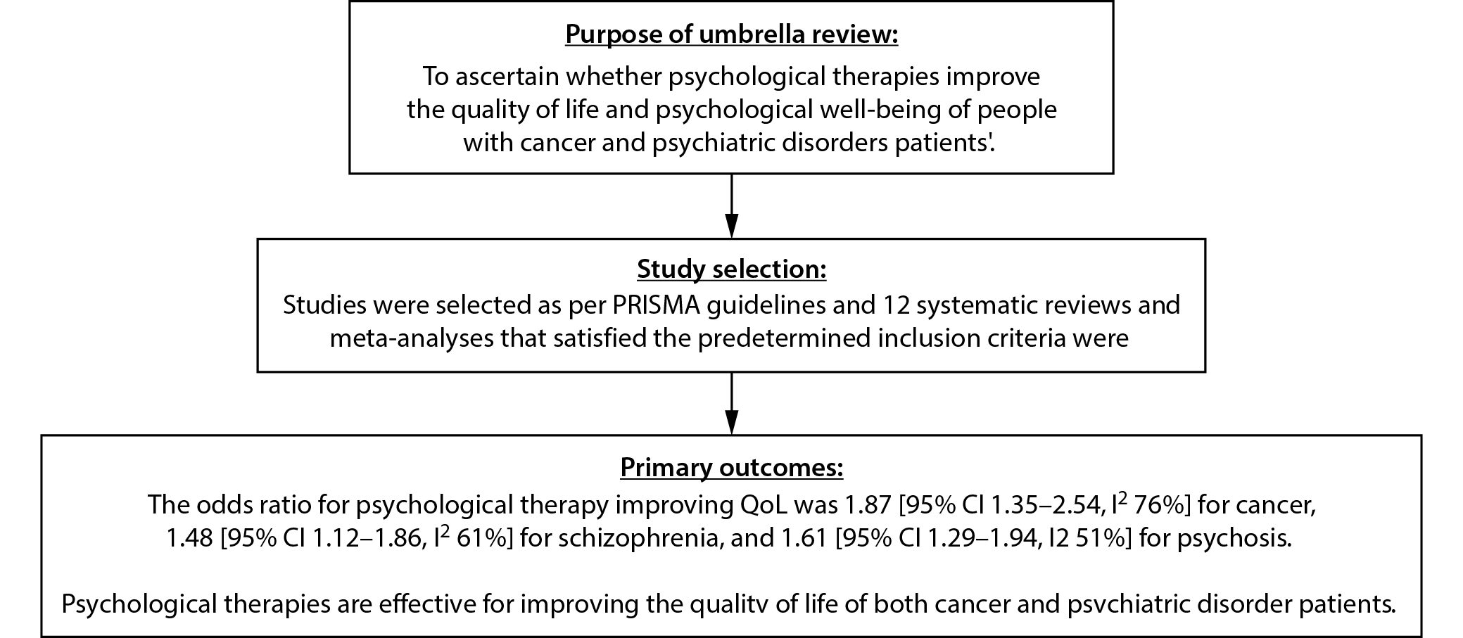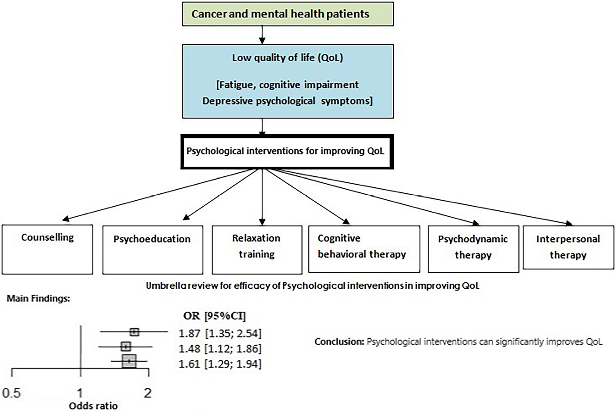 Objectives. An umbrella review of systematic reviews and meta-analyses was conducted to determine the efficacy of psychological interventions in improving the QoL and psychological wellbeing of patients with cancer and mental illness.