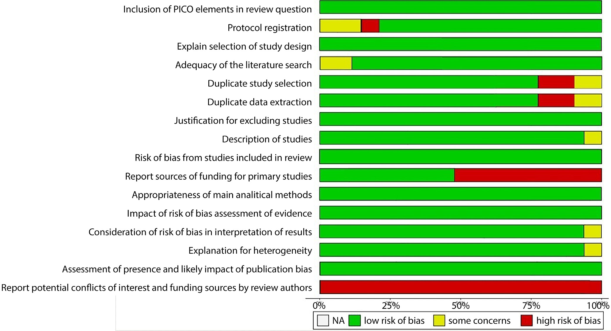 Materials and methods. A comprehensive literature search was conducted across multiple databases, namely PubMed, Embase, Scopus, and Cochrane Library. Assessing the Methodological Quality of Systematic Reviews 2 (AMSTAR-2) was used to evaluate research methodological rigor.