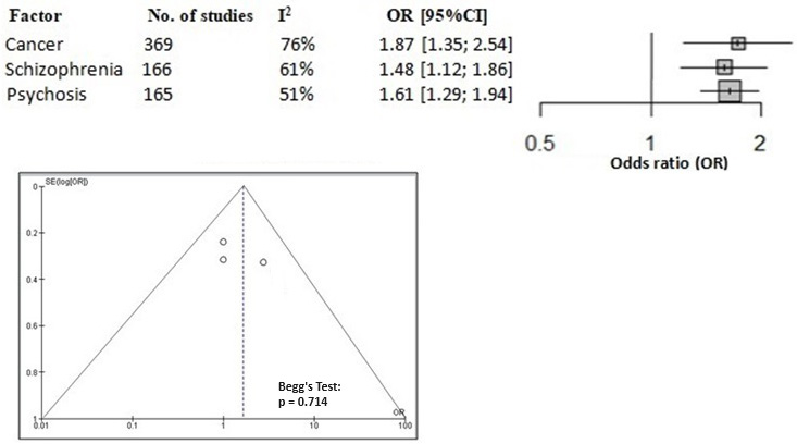 Using the results extracted on changes in QoL scores, the overall OR of the included studies was calculated to assess how strongly psychological interventions were associated with QoL. The studies were grouped based on the health conditions of the participants. A total of 369 studies were found concerning cancer, 166 to schizophrenia and 165 to psychosis. Figure 3 displays the OR forest plot. The OR for the likelihood of psychological therapies to increase QoL was 1.87 (95% CI: 1.35–2.54, I2 = 76%) for cancer, 1.48 (95% CI 1.12–1.86, I2 = 61%) for schizophrenia and 1.61 (95% CI: 1.29–1.94, I2 = 51%) for psychosis. Since all OR values were greater than 1, there is a strong correlation between the 2 parameters and a better chance that psychological intervention will improve the QoL of people with mental illnesses and cancer. Furthermore, the symmetrical funnel plot in Figure 3 and the statistically insignificant Begg’s test (p = 0.714), which is higher than the predetermined significance threshold of 0.05, demonstrates a lack of publication bias. This shows that psychological interventions are very successful in improving the QoL in cancer and psychiatric patients.
