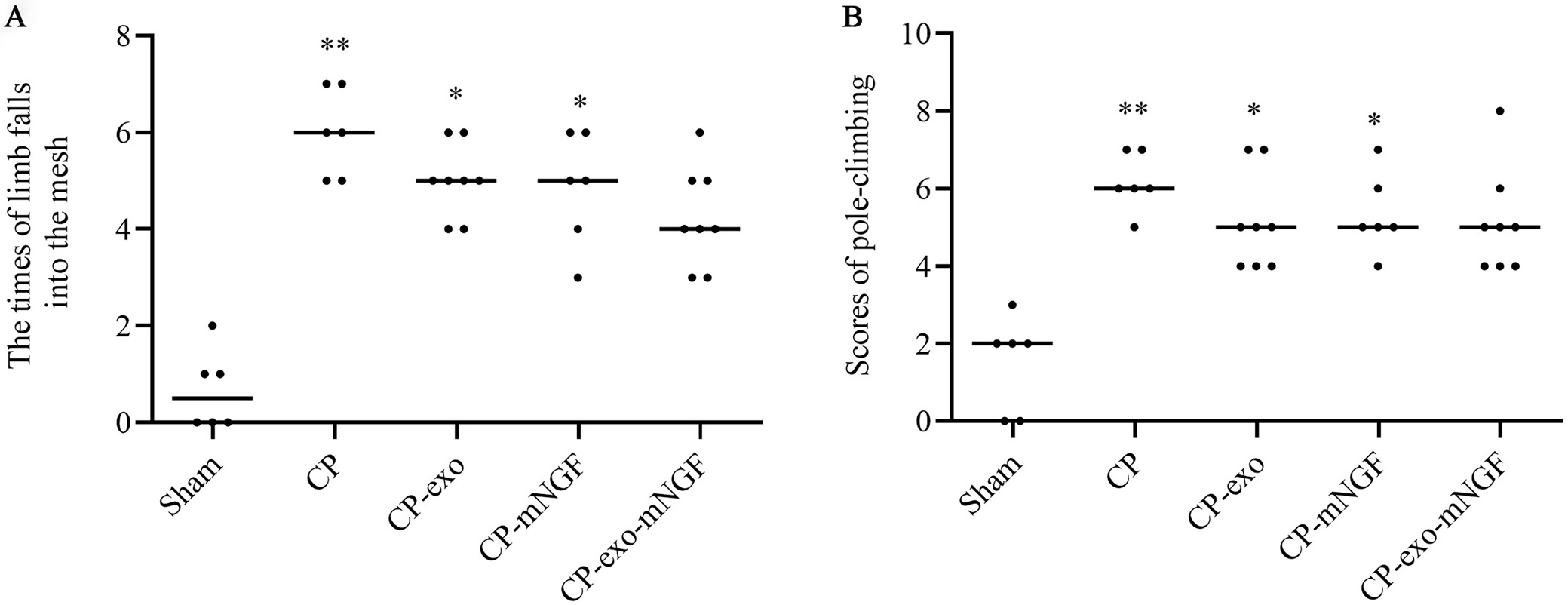 In this study, the balance and motor functions of mice with CP were tested using pole-climbing experiments and the horizontal network test. Following experimental modeling, except for the sham group, most animals in the model group moved autonomously but could not extend their left 2 limbs. Some animals exhibited weak movement in the left limbs and moved in a sideways circle. The frequency of limbs falling into the mesh or the scores from the pole-climbing experiments in mice with CP were significantly higher than those in the sham group (Figure 2, Table 1, Table 2, Table 3, Table 4, Kruskal–Wallis test, all p < 0.001), indicating that there was successful construction of the CP model. The horizontal grid test showed a gradual decrease in the frequency of limbs falling into the mesh in the CP-exo, CP-mNGF and CP-exo-mNGF groups compared to the CP group, with a significant improvement noted in the CP-exo-mNGF group (p = 0.02, Table 3); however, there was no statistical significance after being adjusted with Bonferroni correction. This suggests that the combined treatment of hUC-MSC-exos and mNGF could significantly improve motor disorders in mice with CP. The weight of the experimental animals decreased, except in the sham group, with the least weight loss observed in the CP-exo-mNGF group. Furthermore, the weight gain of the mice in the CP-exo-mNGF group was significantly different from that in the CP group.