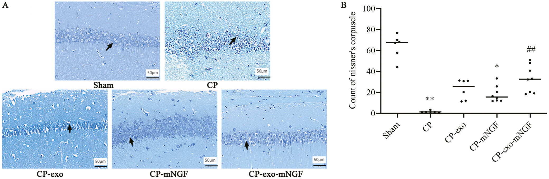 Nissl bodies, a marker of the functional state of neurons, were counted in images at ×400 magnification (Figure 5A). Compared to the sham group, the number of Nissl bodies in the hippocampal pyramidal cells of the mice in the CP group was significantly lower (67.67 (44.00, 76.67) vs 1.33 (0.33, 3.33), Kruskal–Wallis test, H = 4.815, p < 0.001 (Table 5)). In the CP-exo-mNGF group, the number of Nissl bodies was significantly higher than in the CP group, indicating recovery of neuronal function (32.66 (18.33, 50.67) vs 1.33 (0.33, 3.33), Kruskal–Wallis test, H = –3.442, p < 0.001, adjusted p = 0.006 (Table 5)).