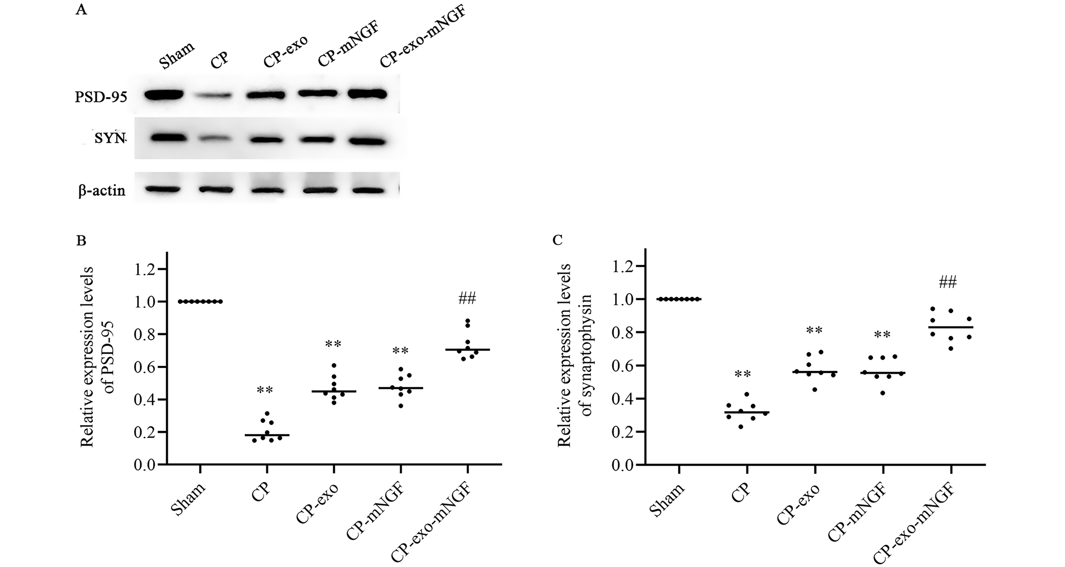 Materials and methods. Exosomes were isolated from hUC-MSCs and examined using transmission electron microscopy (TEM), particle size and western blot (WB). A total of 38 BALB/c mice (male, postnatal day 6 (PND6)) were randomly divided into 5 groups: sham group, CP group, CP-exo group, CP-mNGF group, and CP-exo-mNGF group. Hypoxic induction after unilateral common carotid artery ligation combined with lipopolysaccharide (LPS) infection was used to construct the CP model. Pathological damage to neuron tissue and synaptic structures in the hippocampus was confirmed using light microscopy after hematoxylin–eosin (H&E) staining and TEM, respectively. Survival of neurons was evaluated using Nissl staining. Western blot was applied to monitor PSD-95 and synaptophysin (SYN) protein levels.