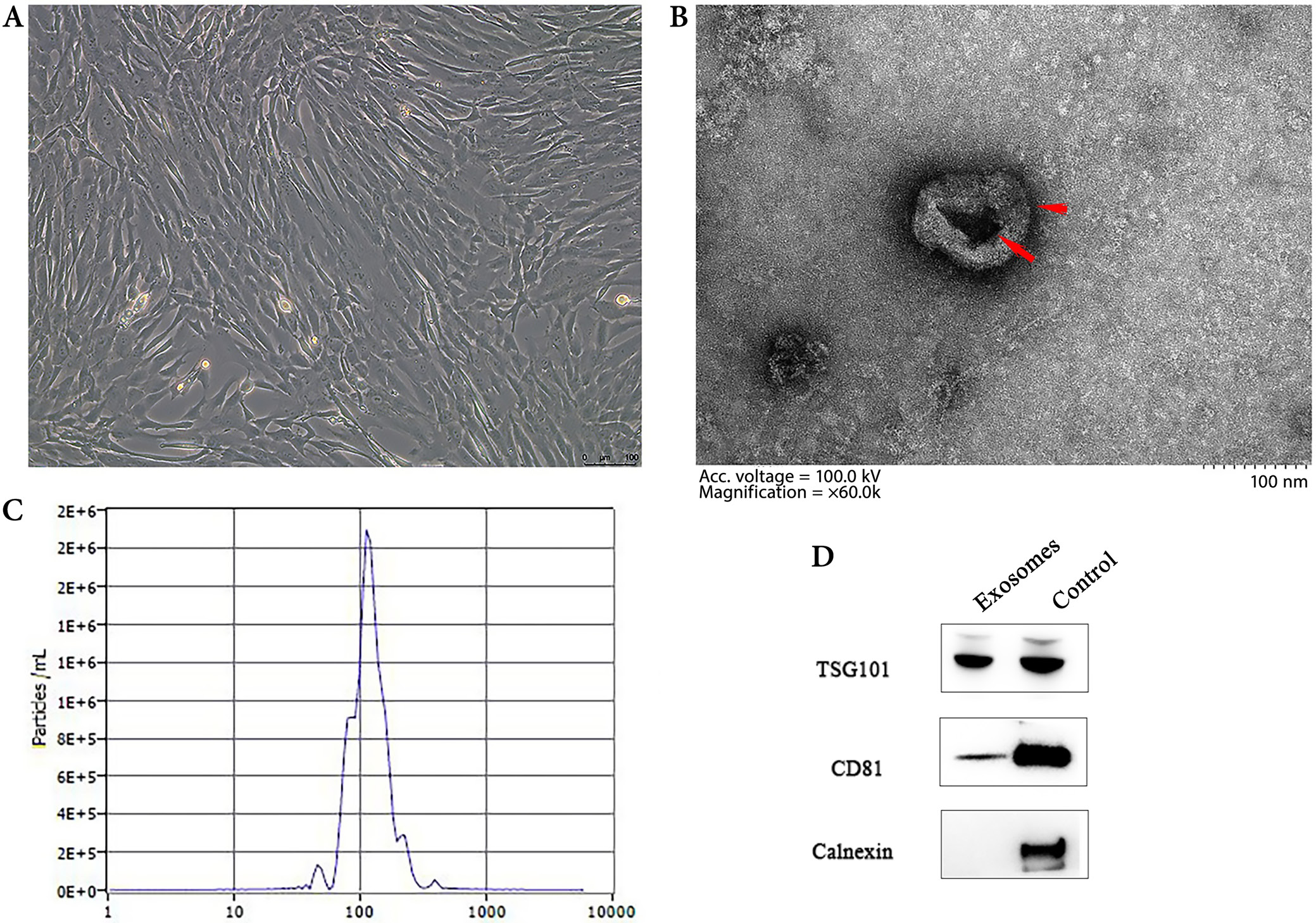 Previous studies have suggested that hUC-MSCs could repair damaged tissues.30 The purchased cells were cultured and passed on (Figure 1A), and hUC-MSCs-exos were obtained using supercentrifugation. Transmission electron microscopy demonstrated that the exosomes had a typical bilayer membrane vesicle structure (Figure 1B). The NTA results showed a diameter distribution average of 123.8 nm (Figure 1C). The highly studied specific markers TSG101 and CD81 expressed positively (Figure 1D). These results suggest that the isolated substances could be identified as exosomes.