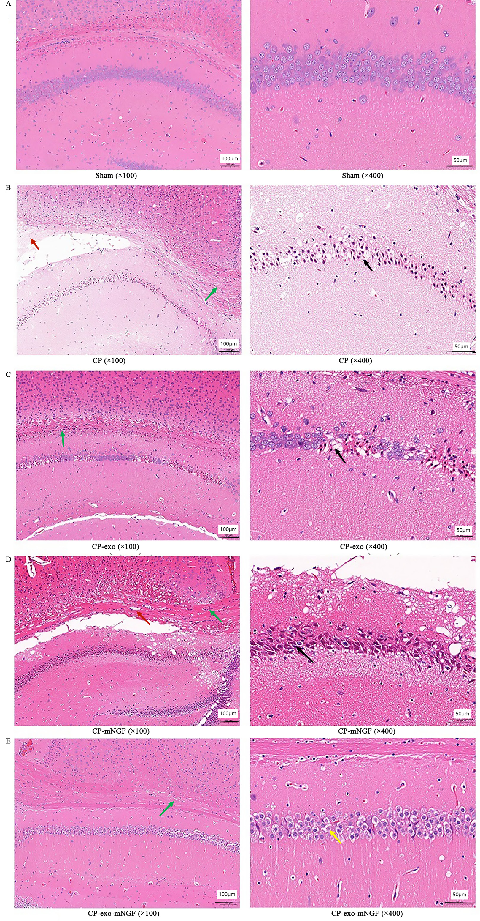 The pia mater was found to be intact using a light microscope (Olympus BX53; Olympus Corp., Tokyo, Japan), with no obvious inflammatory exudation in any group. As shown in Figure 3, compared with the sham group, the pathological changes in the brains of the mice in the CP group, including patchy necrosis, nerve fiber demyelination, glial cell proliferation in the white matter area, and pyramidal cell necrosis in the hippocampus area, were consistent with the characteristic pathological changes in a brain tissue ischemia and hypoxia model, suggesting that the experimental modeling was successful. However, the degree of pathological changes was different in the brain tissues of mice in the CP, CP-exo, CP-mNGF, and CP-exo-mNGF groups. Patchy necrosis was only found in the CP group (83.3%; 5/6) but not in other groups (χ2 = 27.356, p < 0.001). However, demyelination of nerve fibers in the white matter region was identified in the CP, CP-exo and CP-mNGF groups (83% (5/6), 1/8 (12.5%) and 3/6 (50%), respectively). This phenomenon was not found in the CP-exo-mNGF group (χ2 = 17.516, p = 0.02). Glial cell proliferation between nerve fibers was observed in the CP, CP-exo, CP-mNGF, and CP-exo-mNGF groups (83% (5/6), 87.5% (7/8), 83.3% (5/6), and 75% (6/8), respectively), but no differences were found between groups (χ2 = 0.446, p > 0.05). The decreased proportion of pyramidal cell necrosis observed in the hippocampus area in the CP-mNGF and CP-exo-mNGF groups was greater than in the CP group (50% (3/6) and 50% (4/8) vs 100% (6/6), χ2 = 4.00, p = 0.046; χ2 = 4.20, p = 0.040). Compared with the CP group, there was less pathological damage in the CP-mNGF and CP-exo-mNGF groups, and significantly fewer pathological changes were found in the CP-exo-mNGF group. This suggests that mNGF and mNGF-exos could improve pathological damage in CP, while mNGF-exos could improve it more significantly.