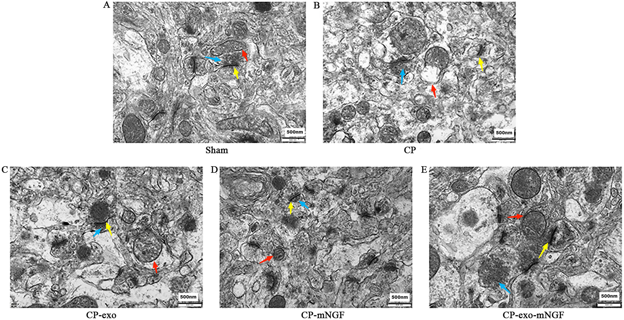 Transmission electron microscopy revealed that the synaptic structures, comprising presynaptic membranes, postsynaptic membranes and synaptic clefts, were well preserved and abundant in the sham group. In contrast, the CP group exhibited significant dissolution of brain tissue structure and blurring of ultrastructures, with few remaining synapses. In the CP-exo and CP-mNGF groups, some regions showed dissolution, but the synaptic structures remained abundant and clear. The CP-exo-mNGF group displayed synaptic structures similar to those of the sham group (Figure 4), highlighting the beneficial effects of the combined treatment on synaptic integrity in the CP models. Neuronal function was severely impaired in mice with CP but could be recovered using hUC-MSCs-exos, and the effect was better when hUC-MSCs-exos were combined with mNGF.