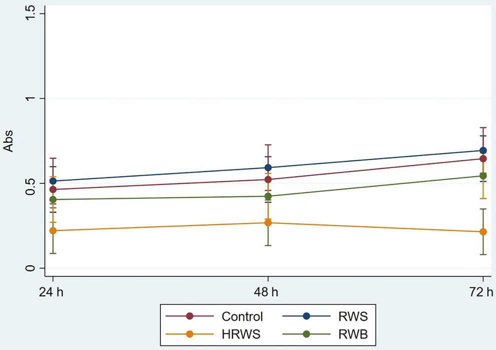 The evaluation indicated that the normality assumption was not met (p < 0.05); however, with ε-HF = 1 it was possible to consider RM-ANOVA robust to non-normality, as reported by Blanca et al.23 The cultures with DMEM reconstituted with filtered RWS displayed a slightly higher mean absorbance value compared to the controls at all observation times (Figure 1, Table 2). The cultures with DMEM reconstituted with filtered RWB, in contrast, displayed lower absorbance values than the controls at all times. The cultures with DMEM reconstituted with filtered HRWB displayed even lower values, with the lowest values observed at 24, 48 and 72 h.