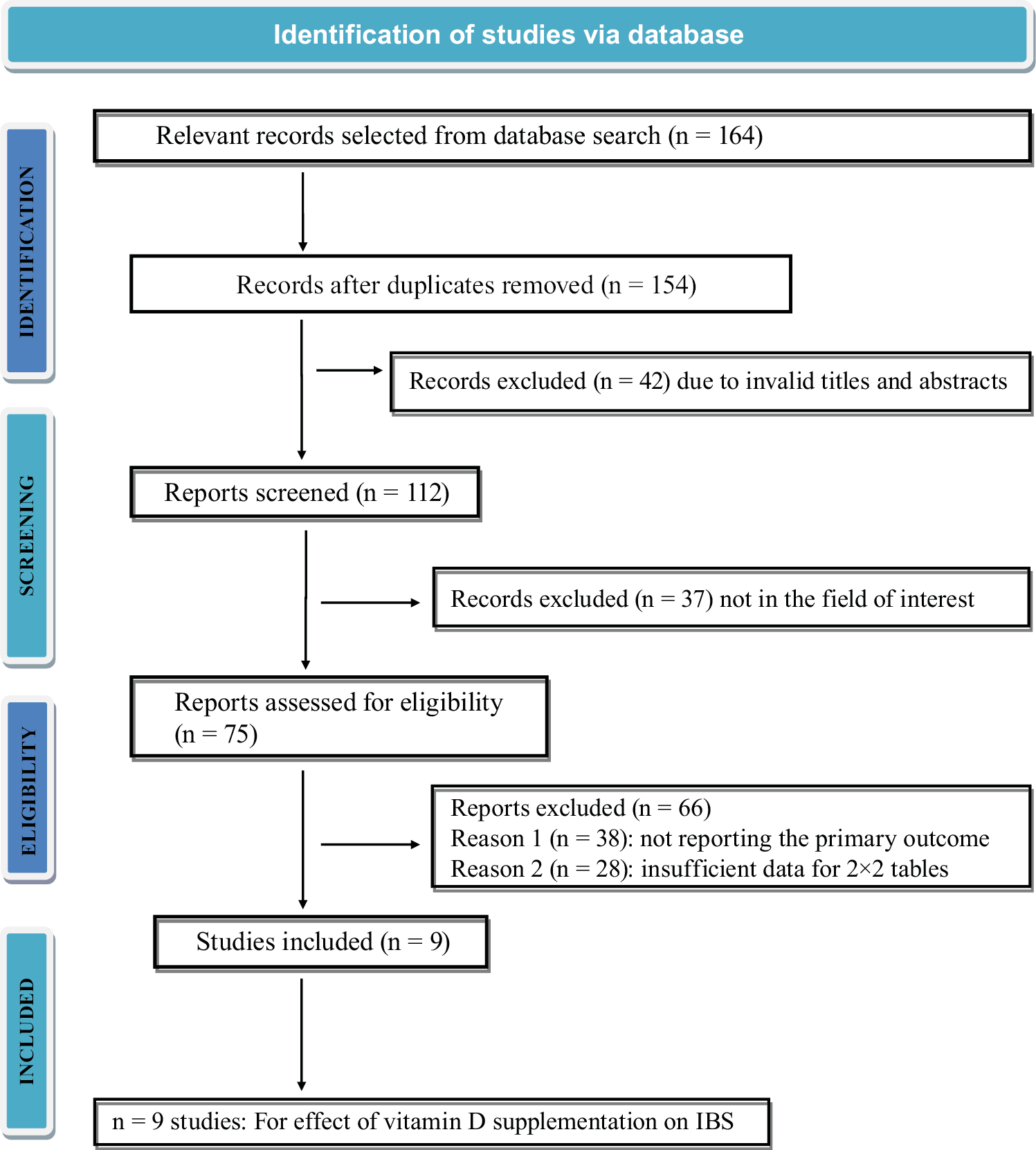 Given the ongoing debate surrounding the efficacy of vitamin D supplementation in the treatment of IBS, this study performed a systematic review and meta-analysis to determine its impact on the severity of symptoms, change in the irritable bowel syndrome severity score (IBS-SSS) and QoL in individuals with IBS using 9 RCTs selected using pre-specified inclusion-exclusion criteria.16, 17, 18, 19, 20, 21, 22, 23, 24