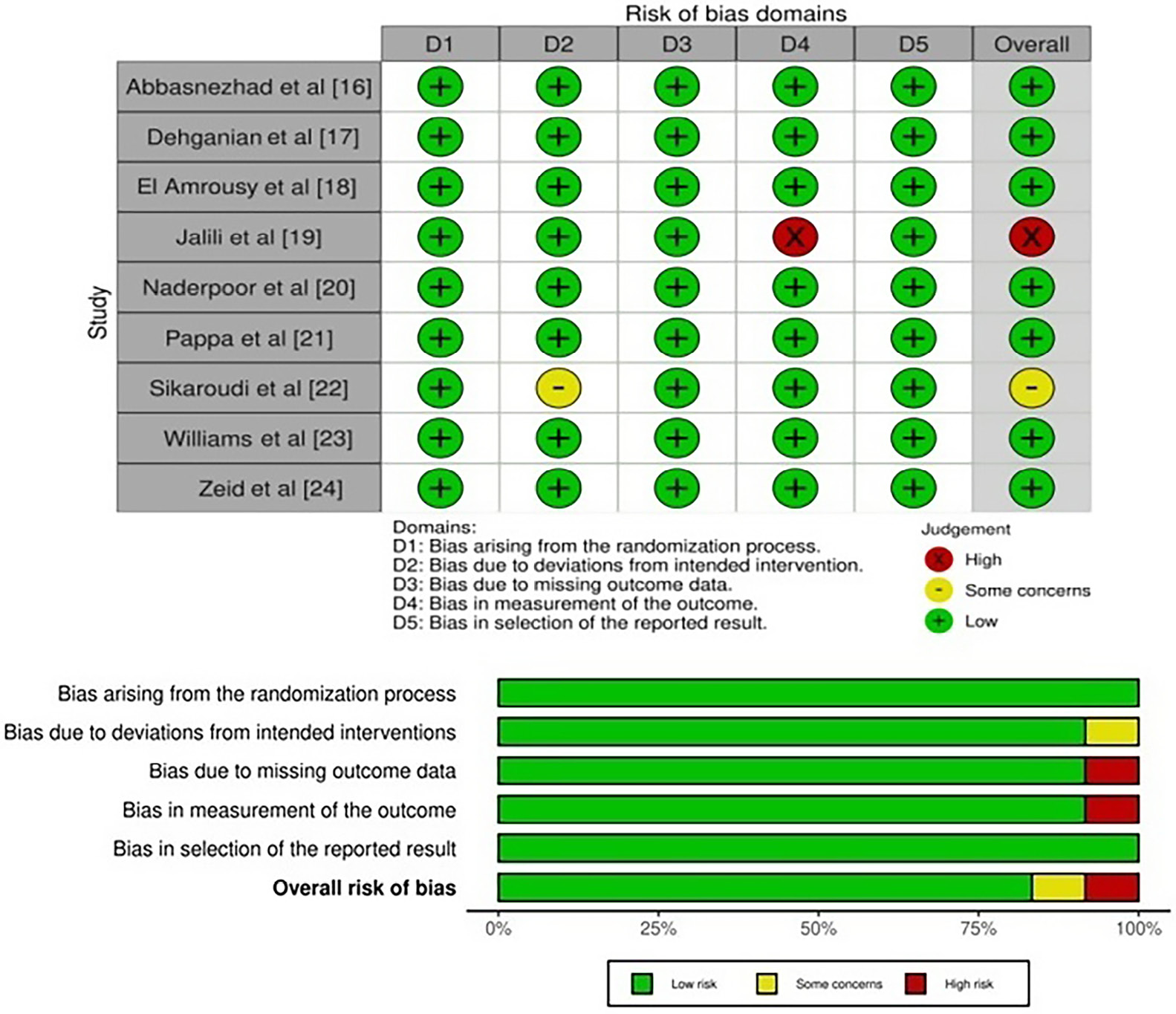 To assess the possibility of bias in the research examined, a well-established and standardized questionnaire was utilized. The evaluation of bias was performed utilizing a method from the Cochrane Collaboration as detailed in the Cochrane Handbook (version 5.3).28 Randomization-induced bias, bias arising from variations from intended interventions, bias due to missing outcome data, bias in outcome assessments, and bias in the selection of reported outcomes were the 5 components taken into consideration in this instrument.