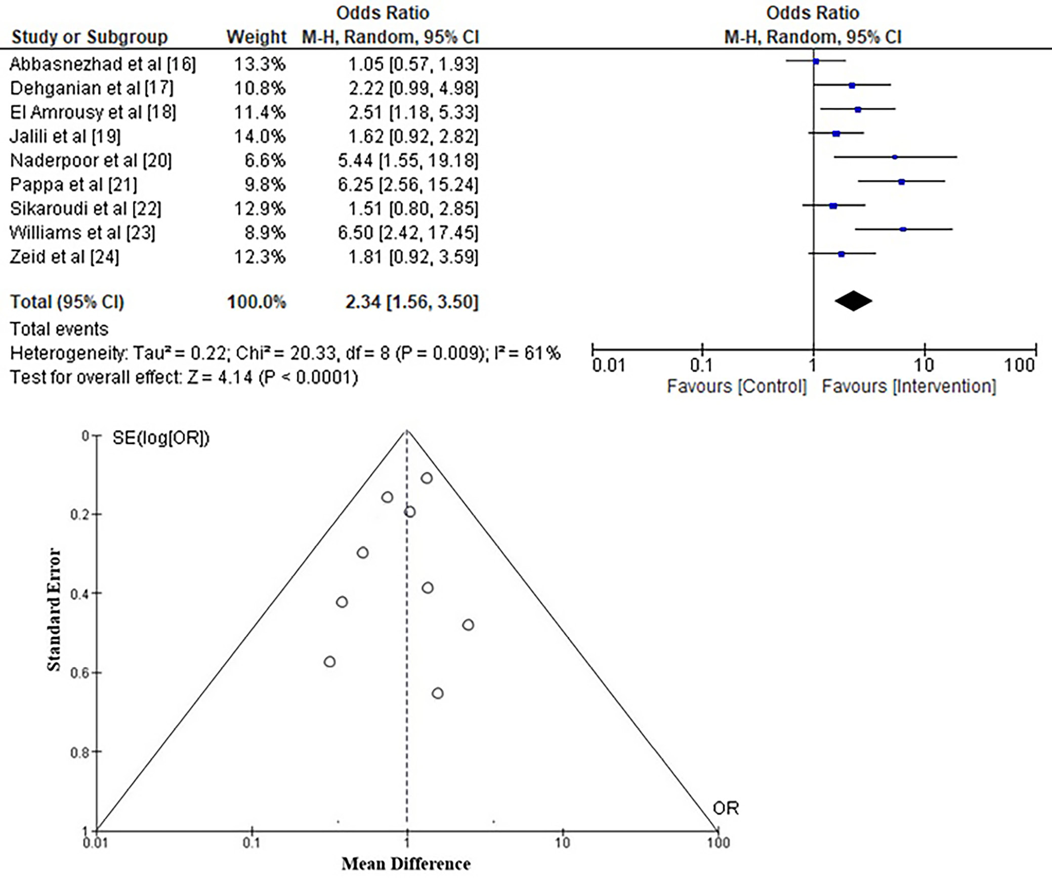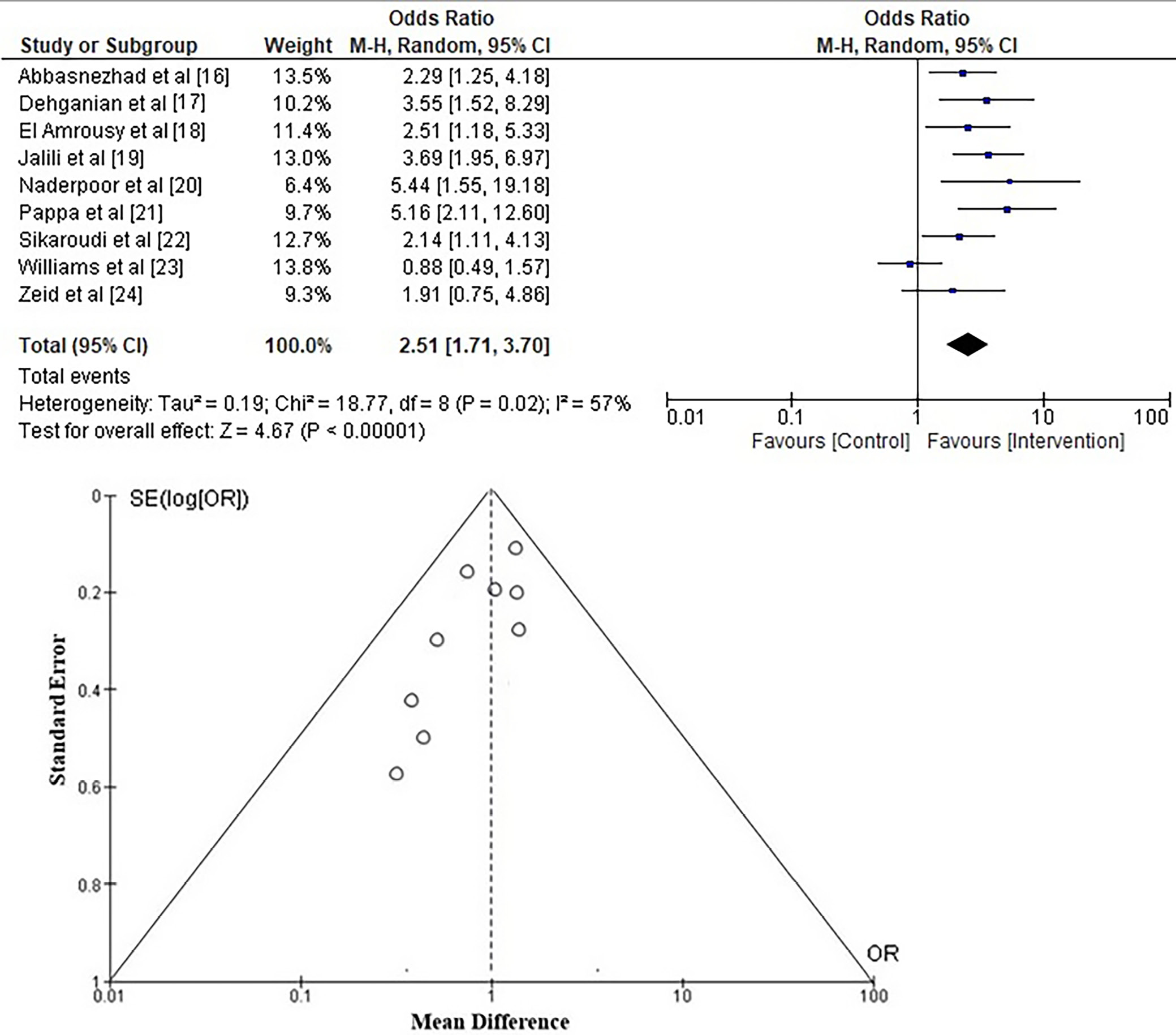 To investigate the likelihood of a change in IBS-SSSs in adolescents and young adults with IBS using vitamin D supplementation, the OR was calculated from the event data extracted from the included studies, as depicted in Figure 3. It was found that vitamin D supplementation has a higher likelihood of improving IBS-SSS scores than control, with an OR of 2.34 (95% CI: 1.56–3.50) and a Tau2 value of 0.220, χ2 = 20.331, degrees of freedom (df) = 8, Z = 4.14, I2 = 61%, and p < 0.001. Furthermore, the funnel plots shown in Figure 3 exhibit a symmetrical structure, suggesting a low likelihood of publication bias. Additionally, the p-value of Begg’s test (p = 0.182) was statistically insignificant, above the specified significance level of 0.05.
