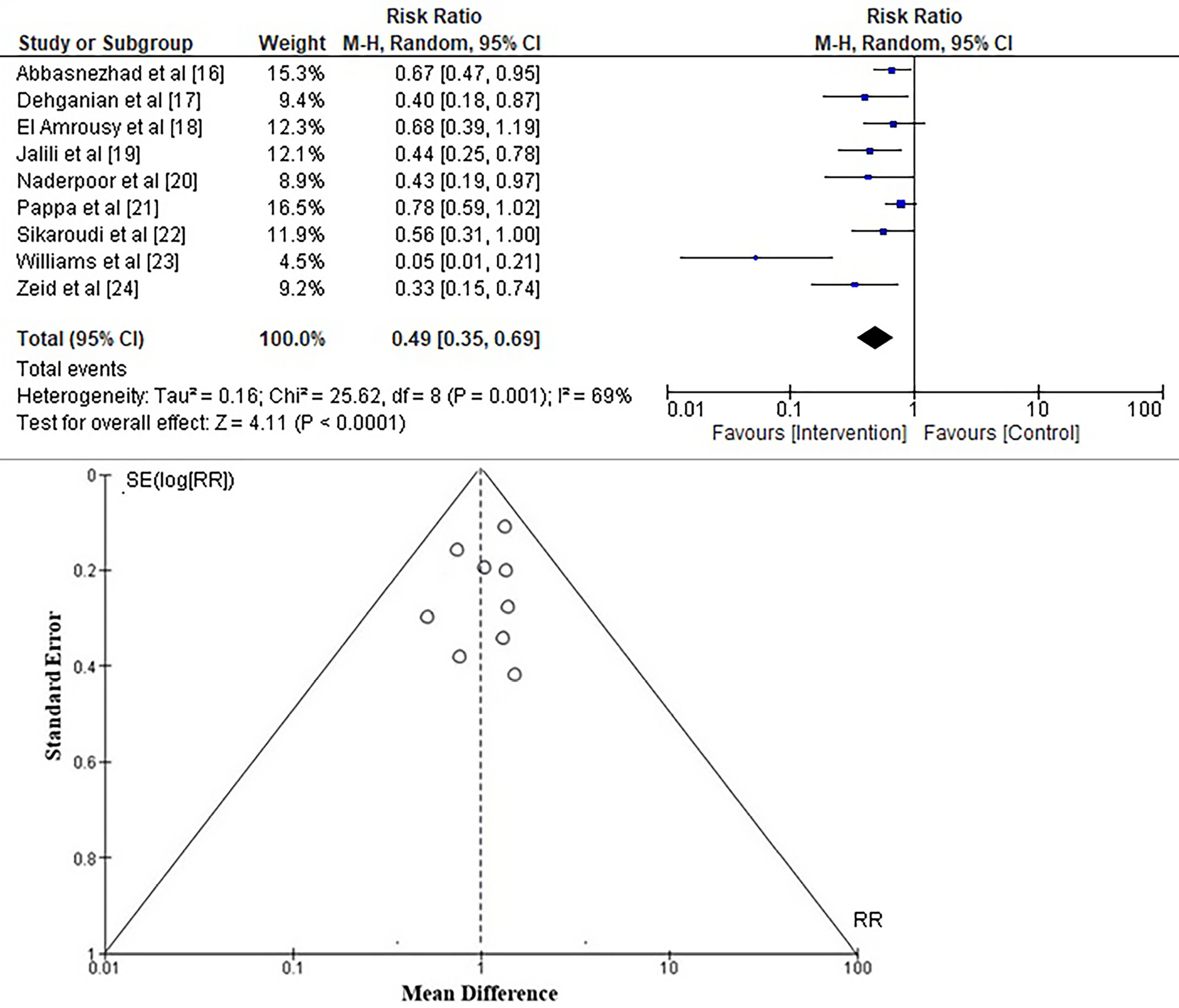 To assess the risk of any adverse events in adolescents and young adults with IBS using a vitamin D supplement, the RR was calculated from the event data extracted from the included studies, as depicted in Figure 5. It was found that vitamin D supplementation has a low risk of adverse events, with an RR of 0.49 (95% CI: 0.35–0.69) and a Tau2 value of 0.16, χ2 = 25.62, df = 8, Z = 4.11, I2 = 69%, and p < 0.001. The symmetrical structure of the funnel plots in Figure 5 and the insignificant statistical p-value of 0.284 for the Begg’s test – which is higher than the preset significance level of 0.05 – also suggest that there is little chance of publication bias.