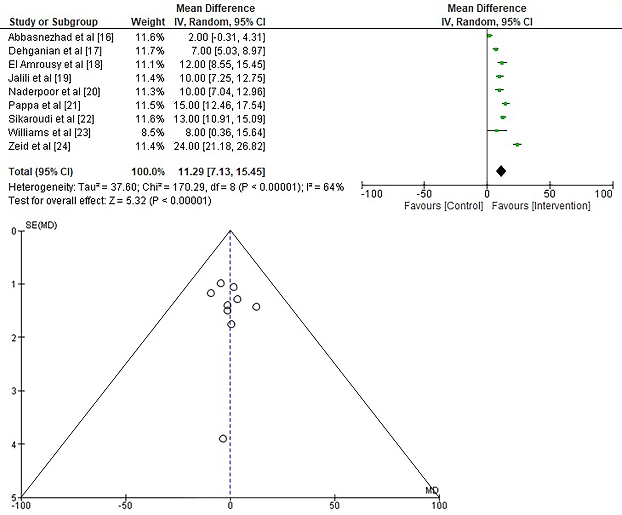 To assess the effect of vitamin D supplementation on the fluctuation of serum 25(OH)D levels in adolescents and young adults with IBS, the MD was calculated using the data collected from the studies included, as shown in Figure 6. The study found a significant increase in serum 25(OH)D levels with vitamin D supplementation. The statistical analysis showed a MD = 11.29 (95% CI: 7.13–15.45; Tau2 = 37.60, χ2 = 170.29, df = 8, Z = 5.32, I2 = 64%, and p < 0.001). Similarly, the symmetrical configuration of the funnel plots depicted in Figure 6 and the statistically insignificant p-value of Begg’s test (p = 0.244), surpassing the predetermined significance level of 0.05, provide more evidence for the unlikelihood of publication bias.