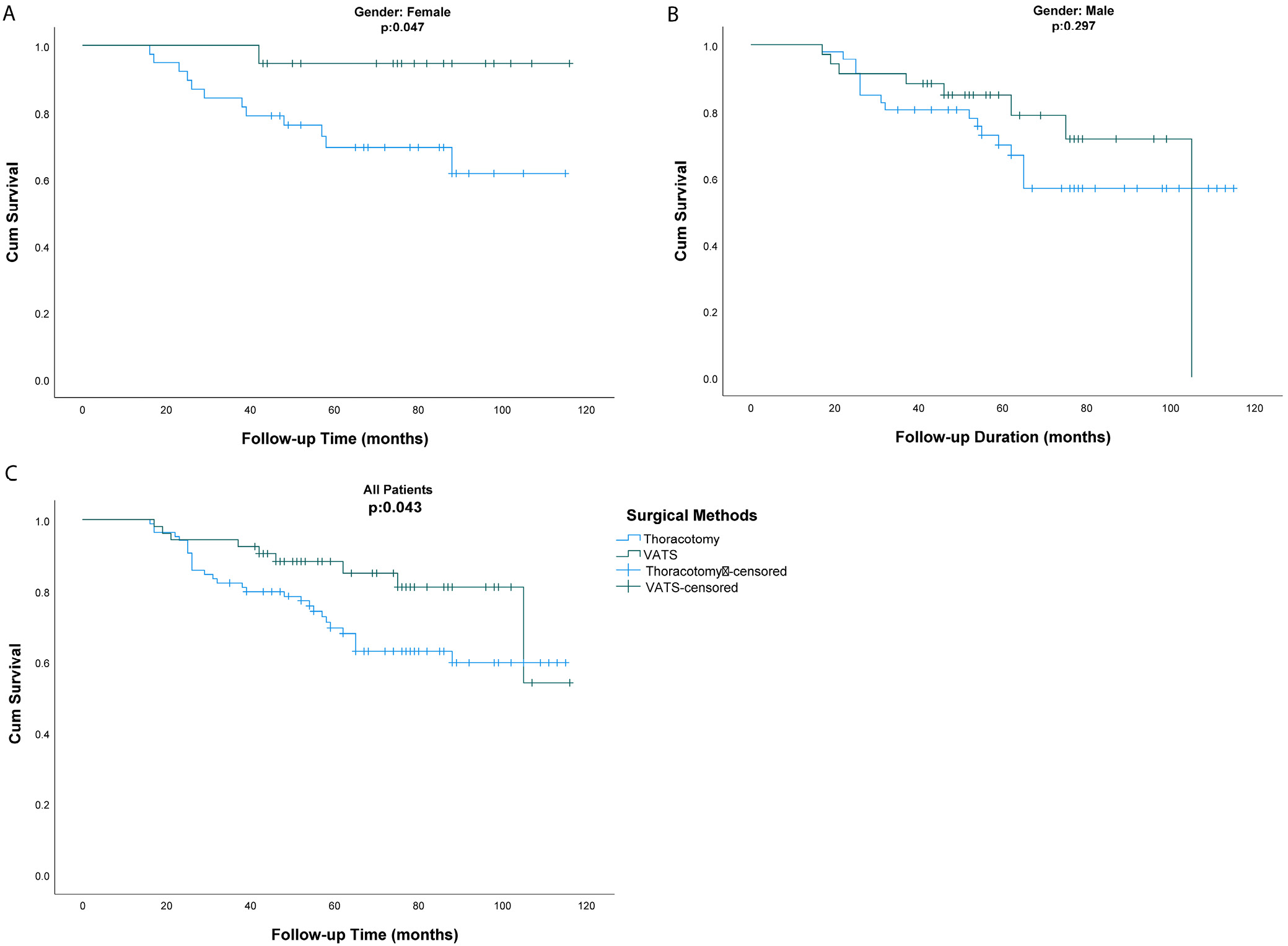 The mean survival time of female patients was 96.45 months, and the survival time of female patients who underwent VATS was significantly longer than those who underwent thoracotomy (p = 0.047). The mean survival time of male patients was 87.5 months. There was no significant difference between the male patients who underwent VATS and those who underwent thoracotomy in survival time (p = 0.297). The survival analysis of the overall sample revealed a mean survival time of 91.80 months, 86.60 months for those who underwent thoracotomy, and 99.57 months for those who underwent VATS. There was a significant difference between the survival time of patients who underwent VATS and those who underwent thoracotomy (p = 0.043, Table 4, Figure 1).
