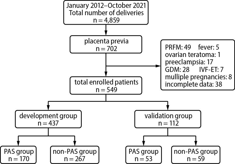 This retrospective analysis included 549 patients with placenta previa who delivered at our hospital from January 2012 to October 2021 (437 patients in the development group, who delivered from January 2012 to December 2018, and 112 patients in the validation group, who delivered from January 2019 to October 2021). Inclusion criteria comprised single pregnancies, live births and gestational weeks ranging from 28 to 42. Exclusion criteria involved neoplastic or infectious diseases, preeclampsia, gestational diabetes mellitus, multiple pregnancies, assisted reproduction, or incomplete data. The research protocol received approval from the Institutional Review Board (approval No. YXLL-KY-2021-018).