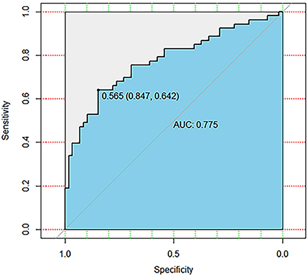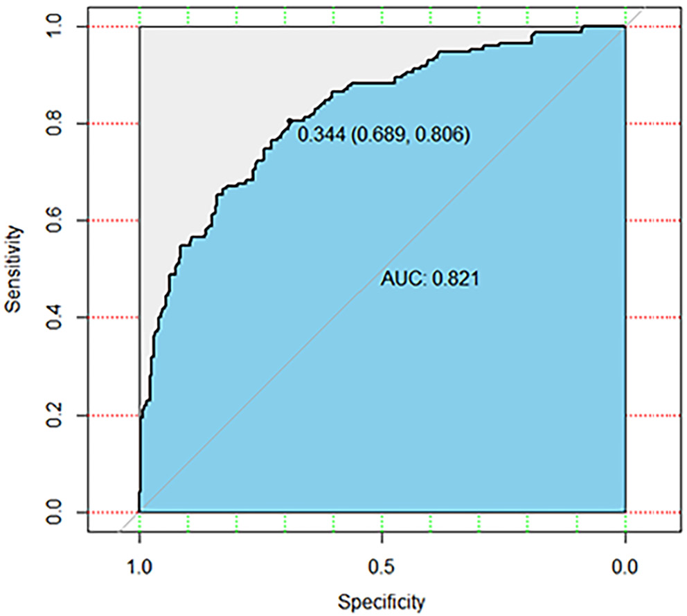The performance of our predictive model in the training set, with an AUC of 0.821 (Figure 2), indicates a strong ability to distinguish between the outcomes of interest, suggesting that the model is highly effective in capturing the essential predictors. The Youden index optimal cutoff value of 0.344, which maximizes the sum of sensitivity and specificity, highlights a well-balanced trade-off between both measures, leading to an overall accuracy of 73.5%. These metrics underscore the robustness of the model in the training phase.
