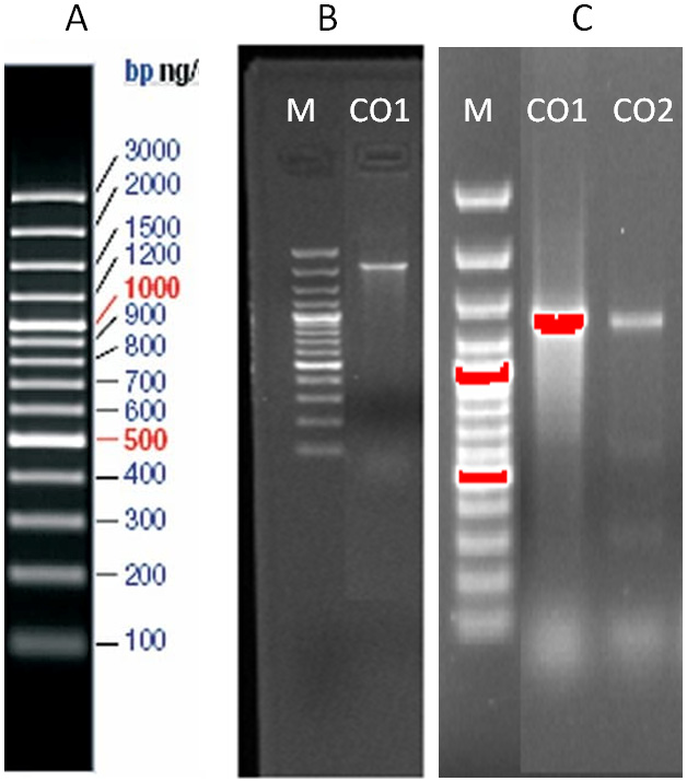 In addition to evaluating antimicrobial susceptibility, our study delved into the molecular mechanisms underlying antibiotic resistance, specifically focusing on the presence of integron gene cassettes. Through agarose gel electrophoresis and subsequent DNA sequencing, we detected the presence of class I and class II integrons in select TMP-SXT-resistant A. baumannii isolates. Specifically, 1 isolate (CO1) harbored a class I integron gene cassette, while both class I and class II integron gene cassettes were identified in 2 isolates (CO1 and CO2). The molecular characterization revealed that the class I integron gene cassette was approx. 2,000 base pairs in size, while the class II integron gene cassette measured approx. 1,271 base pairs (Figure 1).