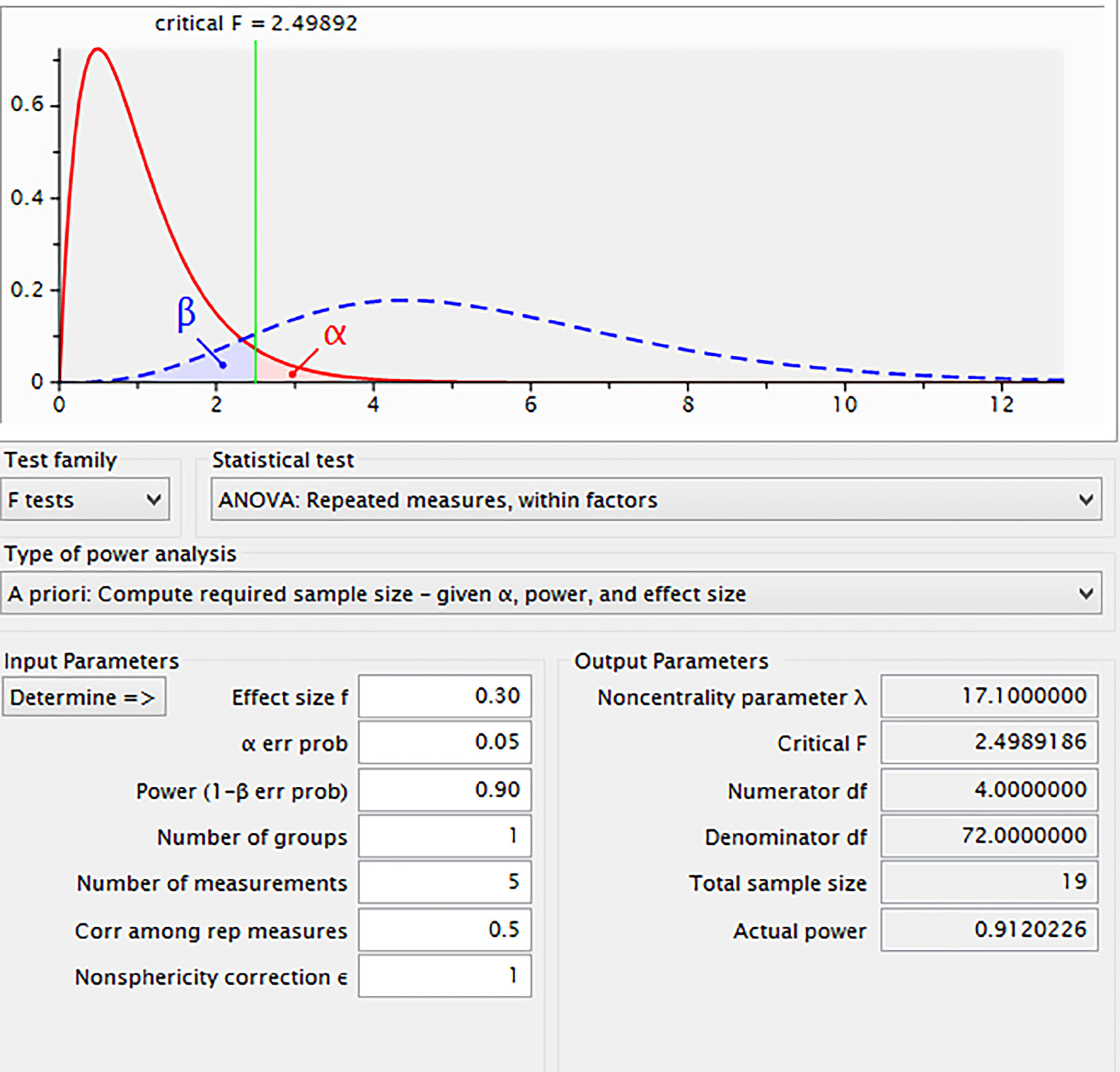A priori power analysis was conducted using G*Power3,106 for repeated measures analysis of variance (ANOVA) with a single group, a medium effect size (d = 0.30), and an α of 0.05 as shown in Figure 2. A dropout rate of 15% is anticipated, with a minimum of 22 participants needed to achieve a power of 0.90. Hence, this research will involve 22 dyads of participants who meet the inclusion criteria.