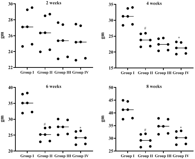 The body weight (BW) gain was considerably reduced (p < 0.05) in DC rats, whereas the BG level was substantially elevated (p < 0.01) against NC (Table 1, Figure 1, Figure 2). Administration of IRB (180 mg/kg) and AC (10 mg/kg) considerably (p < 0.05) enhanced BW gain; however, they reduced the level of BG during the experiment period. The effect was higher in IRB-treated DC rats than in AC-treated rats.