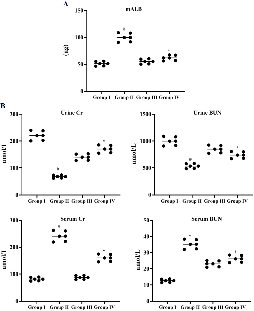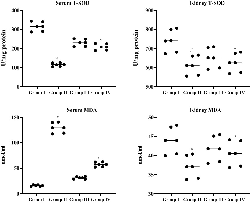 The levels of blood urea nitrogen (BUN) and creatinine (Cr) in urine and serum were estimated spectrophotometrically using the commercial assay kits cat. No. ab83362 (Jiancheng Bioengineering Institute, Nanjing, China) in an Olympus AU 600 Autoanalyzer (Olympus Corp., Tokyo, Japan). Malondialdehyde (MDA) and total superoxide dismutase activity (T-SOD) in serum and kidney were measured with commercial assay kits cat. No. ab118907 provided by Biomed (Badr City, Egypt). The quantity of microalbuminuria (m-ALB) was assayed by commercial kit cat. No. E-TSEL-H0005 (Elabscience Biotechnology, Wuhan, China) as per the manufacturer’s protocol.