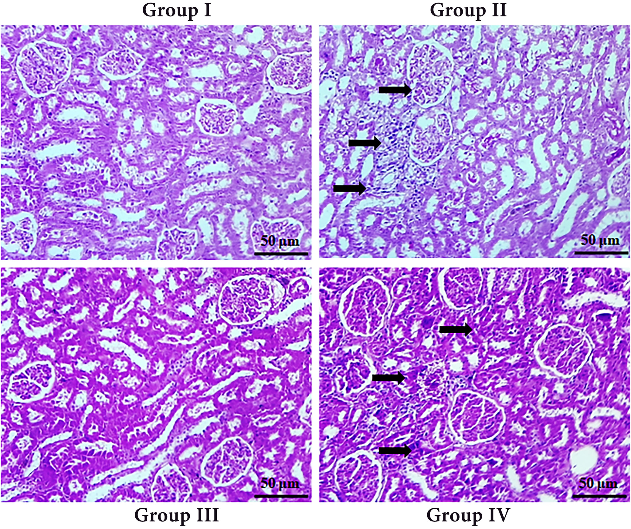 For histopathological examination, the kidney was separated, tissues fixed with formalin (10%) and paraffin-embedded. To evaluate histopathological variations in the kidneys, 5-µm sections were cut using rotary microtome (HV-HSMA-1090A; Hoverlabs, Ambala, India) stained with hematoxylin and eosin (H&E), and observed through a microscope (BS-2074T; Beijing BestScope Technology Co., Ltd., Beijing, China).