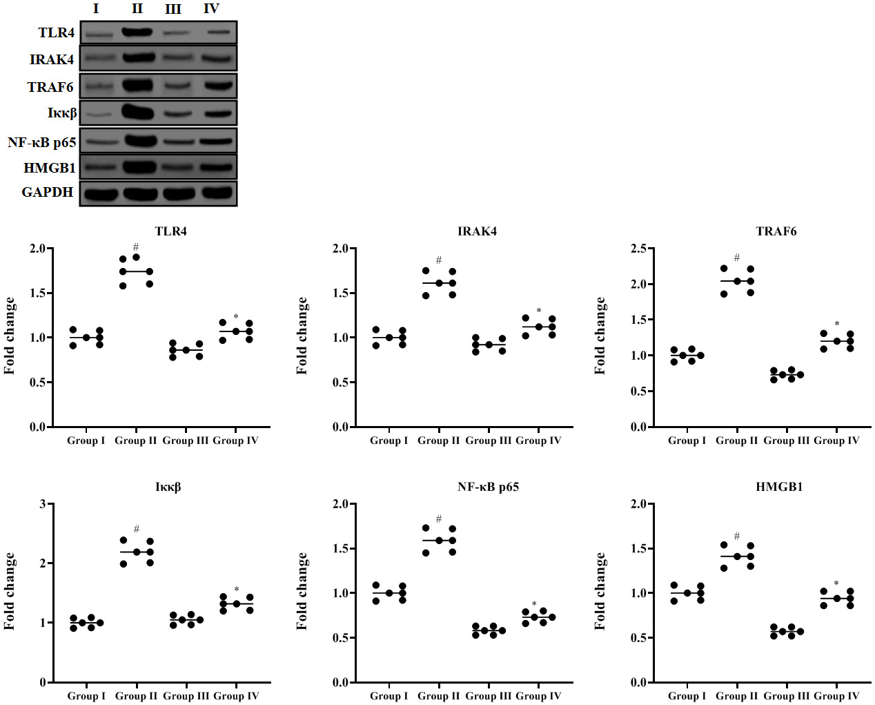 Total proteins were isolated from the rat’s kidney tissue homogenate for the assessment of the role of AC and IRB on the signaling of TLR4/NF-κB. Kidney tissues were prepared by adding lysis buffer in ice-cold conditions for western blot analysis. Briefly, total protein was estimated using the Protein Assay Kit (Pierce Chemical Co, Rockford, USA), quantified, electrophoretically dispersed, and transferred to a polyvinylidene difluoride (PVDF) film. It was blocked by using a probe at room temperature for 1 h with treated primary antibodies TLR4, interleukin 1 receptor-associated kinase 4 (IRAK4), tumor necrosis factor receptor-associated factor 6 (TRAF6), inhibitory kappa B kinase beta (IKKβ), nuclear factor kappa-light-chain-enhancer of activated B cells (NF-κBp65), and HMGB1. in 1:1,000 dilutions, and kept at 4°C overnight. Then, horseradish peroxidase (HRP)-conjugated secondary antibodies were administered. The protein bands were stained and imaged for protein recognition. Protein bands were quantified through densitometry with ImageJ (National Institutes of Health (NIH), Bethesda, USA) and normalized to glyceraldehyde 3-phosphate dehydrogenase (GAPDH) expression.