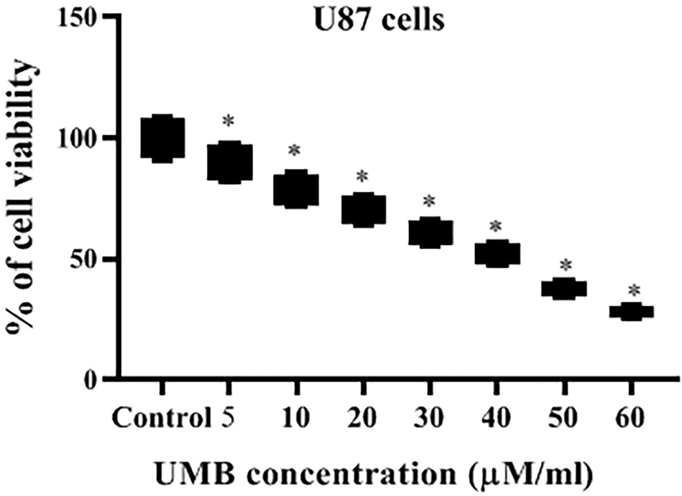 Human U-87 GBM cell viability was assessed using the MTT test with different concentrations (5–60 μM/mL) of UMB. The data revealed that UMB reduced viability through its cytotoxic and antiproliferative actions on GBM cells in a dose-dependent way. Umbelliferone treatment at a concentration of less than 10 μM did not expressly alter the antiproliferation and cytotoxicity results for GBM cells. Conversely, higher concentrations of UMB (30 and 40 μM/mL) substantially reduced (p < 0.05) the viability of both U-87 cells compared to an untreated control. Using MTT assay, we detected the IC50 values of the GBM cells. Recognized based on the figure of the inhibitory concentration data of 30 and 40 μM/mL, UMB was taken for further trials (Table 1, Figure 1).