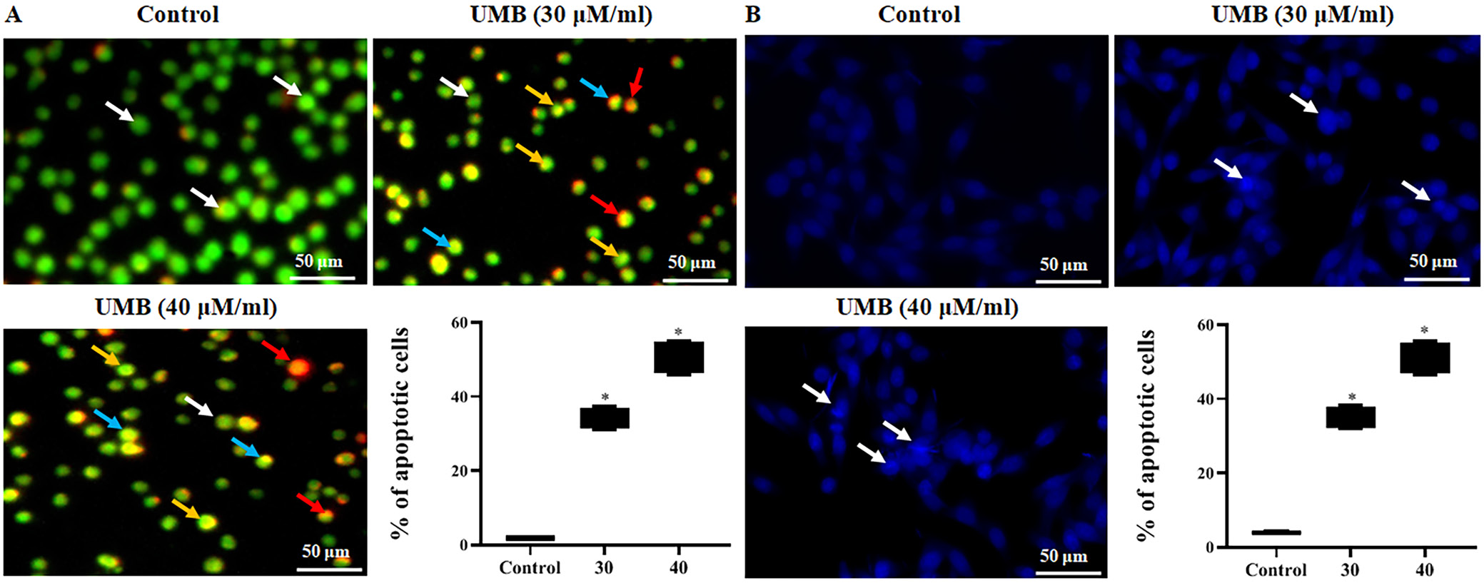 The apoptotic morphology of the human U87 cells after exposure to UMB was evaluated using acridine orange/ethidium bromide (AO/EB) staining.25 Glioblastoma multiforme cells were supplemented with different concentrations of UMB (30 or 40 µM/mL) and kept for 1 day. The UMB-supplemented and control cells were treated with an AO/EB (100 µg/mL each dye) mixture. All groups were kept in the dark at room temperature for 20 min, ensuring unattached dye was separated using PBS and detected using a fluorescence microscope (model BX51; Olympus Corp., Tokyo, Japan).