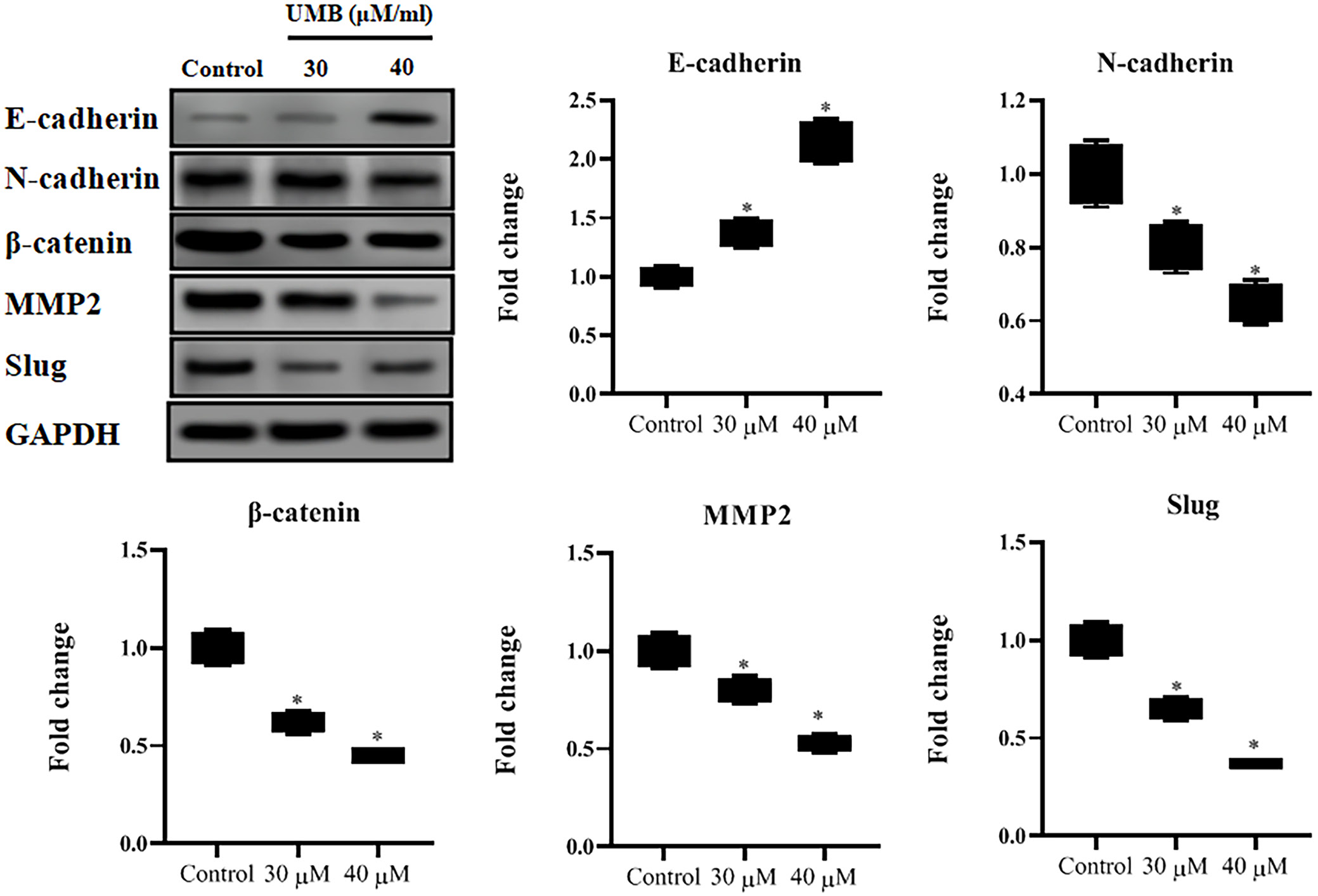 For U-87 human GBM cells supplemented with UMB (30 or 40 μM/mL), E-cadherin protein expression was elevated, whereas N-cadherin, β-catenin, MMP-2, and Slug showed attenuated protein expression. These results confirmed the apoptotic action of UMB in a concentration-dependent way (Table 2, Table 3, Figure 5).