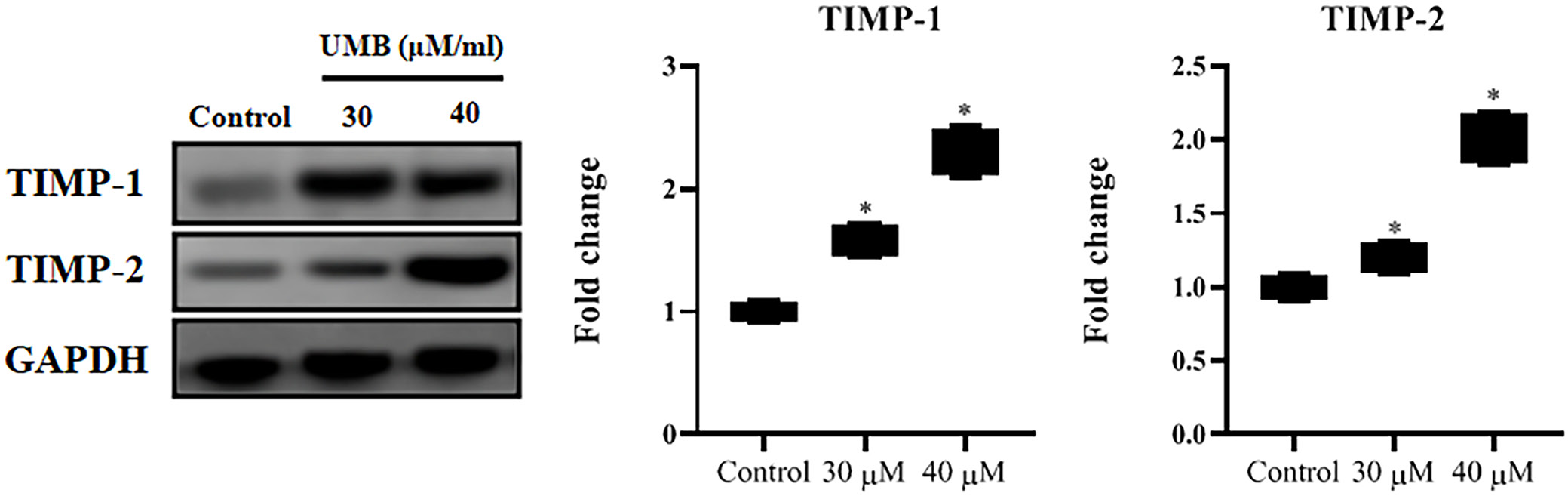 TIMP-1 and TIMP-2 expressions were downregulated in untreated glioma cells. The GBM cells supplemented with 30 or 40 μM/mL UMB upregulated TIMP-1 and TIMP-2 protein expression in a quantity-dependent way (Table 2, Table 3, Figure 6).