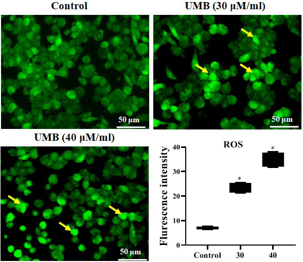 The formation of intracellular ROS is related to numerous stimuli, and it can trigger cell death and cell cycle arrest. Intracellular ROS levels were elevated in U-87 cells after being supplemented with 30 or 40 µM/mL UMB in an amount-dependent way, in contrast to the control. To clearly distinguish the accumulation of ROS, the DCFH-DA-labeled cells were examined under a BX51 fluorescence microscope (Olympus Corp.). The intensity of ROS was greatly augmented with 40 µM/mL of UMB (Table 2, Table 3, Figure 2).