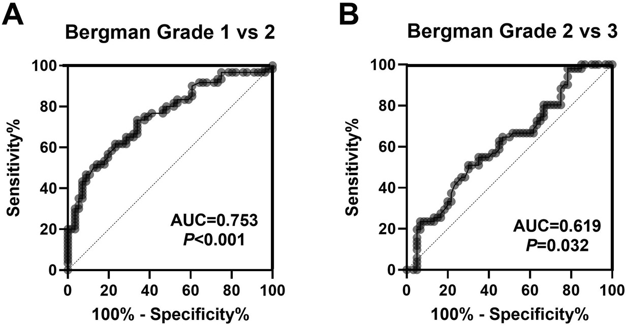 The ROC curve analysis was conducted to evaluate the diagnostic potential of NLRP3 in EPS as a possible biomarker for CP/CPPS. As shown in Figure 3, elevated NLRP3 levels showed a significant AUC in discriminating between Bergman grade 1 and Bergman grade 2 (AUC = 0.753, p ≤ 0.001) (Figure 3A) as well as Bergman grade 2 compared to Bergman grade 3 (AUC = 0.619, p = 0.032) (Figure 3B). These findings suggest that elevated EPS NLRP3 level may serve as a potential diagnostic marker to evaluate disease severity in CP/CPPS. The cutoff value of EPS NLRP3 expression was ≥55.25 ng/mL.