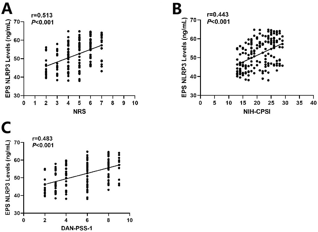 The association between NLRP3 levels in EPS and clinical outcomes was examined, as measured with NRS, NIH-CPSI and DAN-PSS-1 scores. We found EPS NLRP3 levels were positively associated with NRS scores (Spearman’s correlation, r = 0.513, T(N-2) = 165, p < 0.001) (Figure 4A), NIH-CPSI scores (Spearman’s correlation, r = 0.443, T(N-2) = 65, p < 0.001) (Figure 4B) and DAN-PSS-1 scores (Spearman’s correlation, r = 0.483, T(N-2) = 165, p < 0.001) (Figure 4C). These findings imply that CP/CPPS patients with higher EPS NLRP3 levels may suffer more severe clinical symptoms.