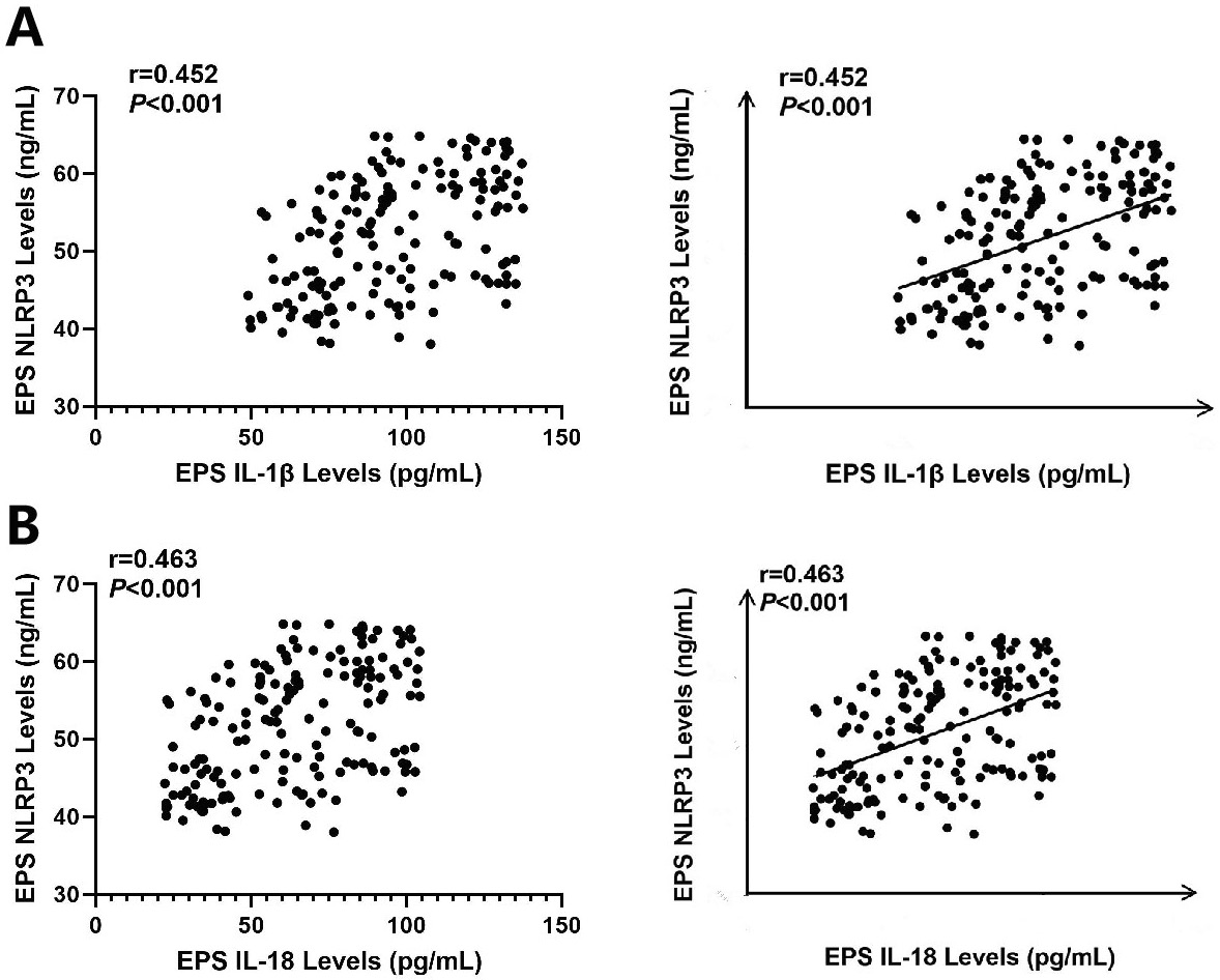 Interleukin 1 beta and IL-18 have been shown to be important markers in CP/CPPS. Interleukin 1 beta18 and IL-1819 have been implicated as potential triggers of CP progression. In this study, EPS NLRP3 levels were positively correlated with EPS IL-1β levels (Spearman’s correlation, r = 0.345, T(N-2) = 165, p < 0.001) (Figure 5A) and IL-18 levels (Spearman’s correlation, r = 0.326, T(N-2) = 165, p < 0.001) (Figure 5B).