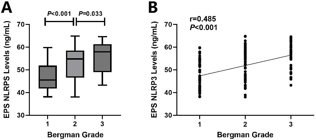 The EPS NLRP3 levels of the 167 NIH-III CP patients with different Bergman grades are shown in Table 1. NIH-III CP patients were divided into 3 groups based on Bergman grade. NIH-III CP patients included 56 patients with Bergman grade 1, 60 with Bergman grade 2 and 51 with Bergman grade 3. NIH-III CP patients with Bergman grade 3 showed significantly higher EPS NLRP3 concentrations compared to those with Bergman grade 2 (55.8 ±6.5 ng/mL vs 53.0 ±7.3 ng/mL, Mann–Whitney U test, U = 827.5, df = 109, p = 0.033) (Figure 2A). NIH-III CP patients with Bergman grade 2 demonstrated significantly higher EPS NLRP3 levels compared with Bergman grade 1 (53.0 ±7.3 ng/mL vs.46.8 ±5.9 ng/mL, Mann–Whitney U test, U = 1,168, df = 114, p < 0.001) (Figure 2A). The analysis using Spearman’s correlation revealed a positive relationship between NLRP3 levels in EPS and Bergman grade, with a correlation coefficient of 0.485, indicating a statistically significant association (Spearman’s correlation, r = 0.485, T(N-2) = 165, p < 0.001) (Figure 2B).