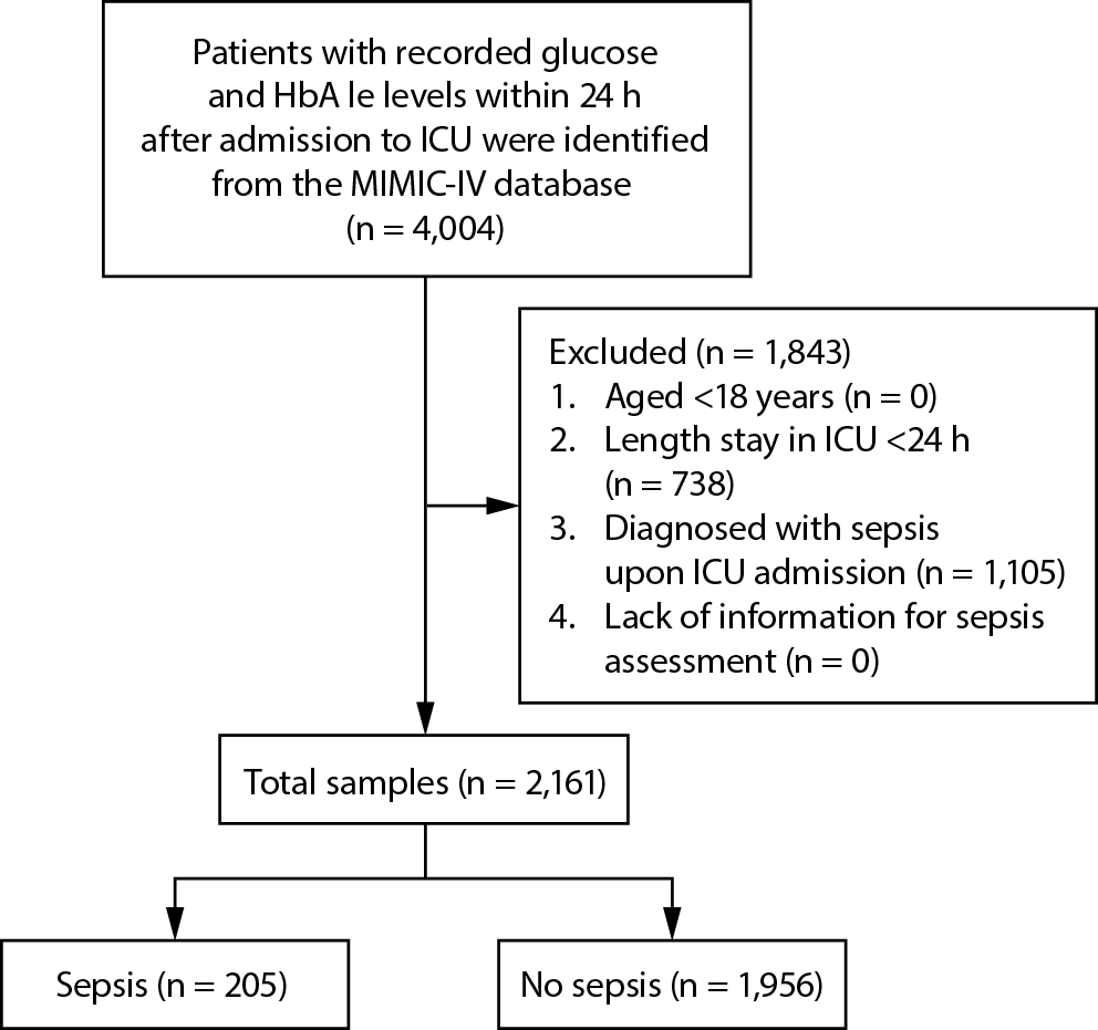 The inclusion criteria were patients with glucose and HbA1c examinations within 24 h after admission to ICU. The exclusion criteria were as follows: patients who 1) were under 18 years of age, 2) had a duration of ICU stay shorter than 24 h, 3) were diagnosed with sepsis upon ICU admission, and 4) for whom requisite information for sepsis assessment was lacking.