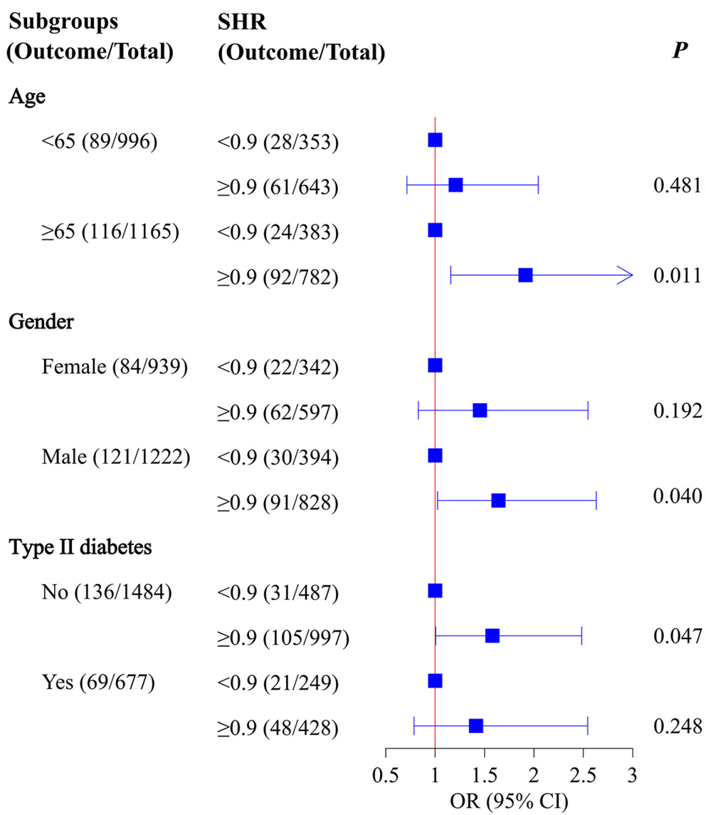 In patients aged ≥65 years (OR: 1.91, 95% CI: 1.16–3.17, p = 0.011), among men (OR: 1.64, 95% CI: 1.02–2.63, p = 0.040) and in patients without history of type 2 diabetes (OR: 1.58, 95% CI: 1.01–2.48, p = 0.047), elevated levels of SHR were associated with higher odds of sepsis (Figure 2). The baseline blood glucose level did not exhibit a significant association with the risk of sepsis in these patients (p > 0.05) (Table 3).