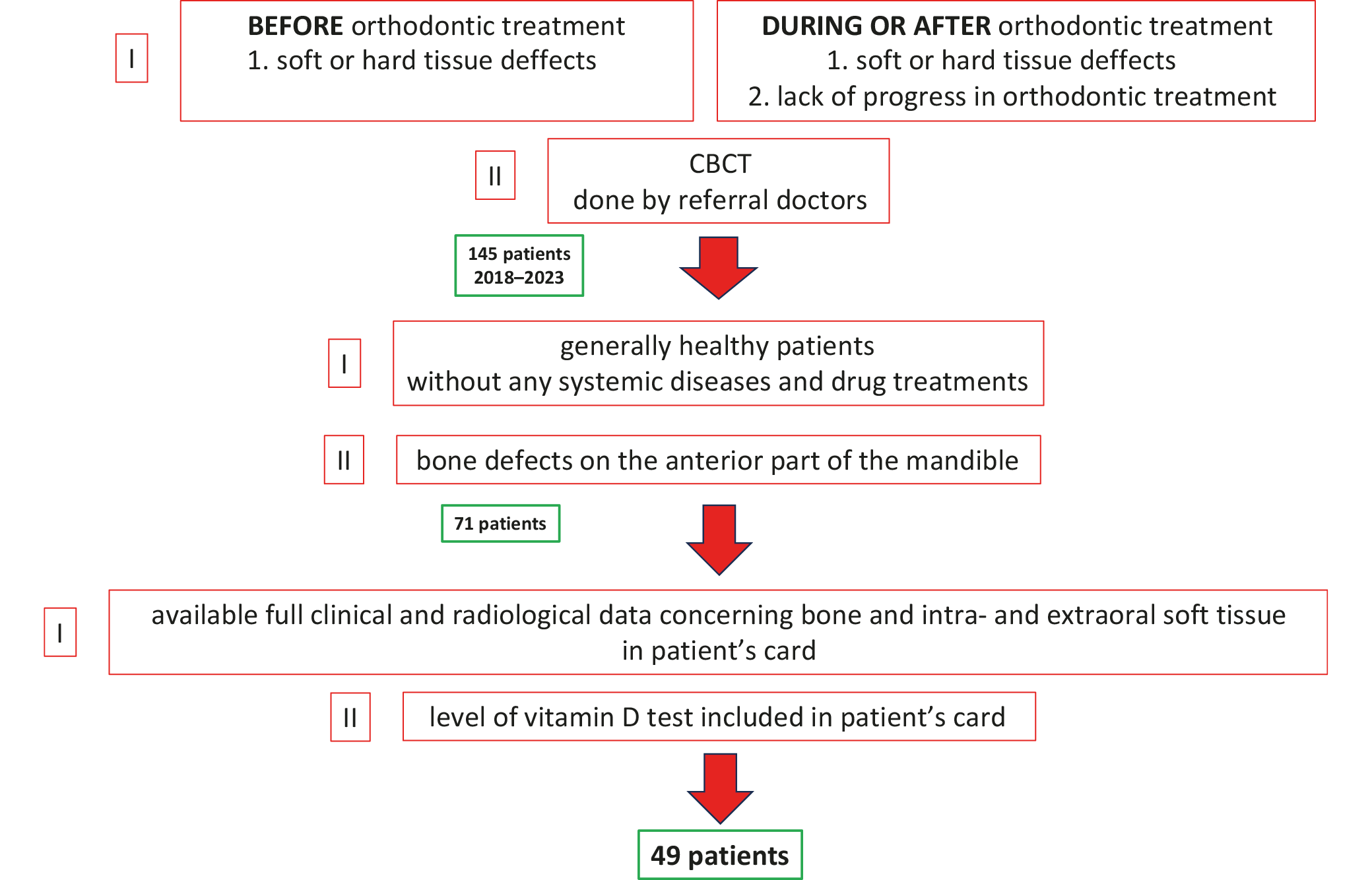 Between 2018 and 2023, 145 patients were referred to a private dental clinic in Wrocław, Poland, for consultation regarding soft or hard tissue prior to (group 1) and during or after (group 2) orthodontic treatment. Group 1 consisted of 16 patients, of whom 10 were women (62.5%), with a mean age of 35 years. Group 2 comprised 33 patients, with 28 women (84.8%) and a mean age of 39 years. As a result, a group of 49 patients was identified. The analysis included adult Caucasian patients of both genders who were referred as follows: